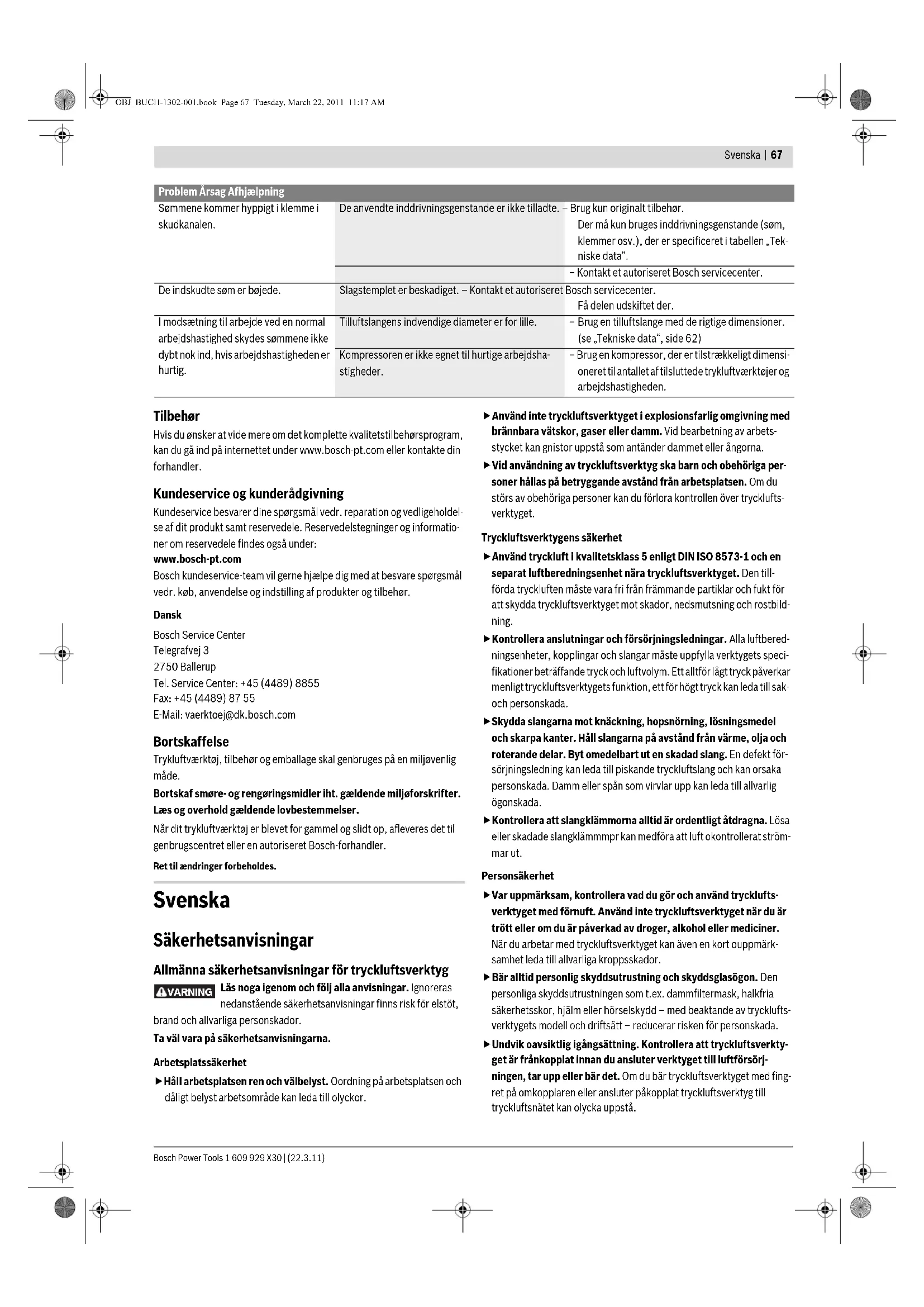 Justerbar luftudgangskappe (se Fig. I) Med den justerbare udsugningskappe på luftudgangen 4 kan du dirigere udsugningen fra dig eller emnet væk. Transport og opbevaring Afbryd trykluftværktøjet fra luftforsyningen, før det transporteres, især hvis du bruger stiger eller bevæger dig i usædvanlige kropsholdninger. Bær på arbejdspladsen altid trykluftværktøjet i håndgrebet 7 og sørg altid for, at udløseren 5 ikke er aktiveret. Opbevar altid trykluftværktøjet et tørt, varmt sted, separat fra luftforsy- ningen. Skal trykluftværktøjet ikke bruges i længere tid, forsynes værktøjets stål- dele med et tyndt lag olie. Dette forhindrer rustaflejring. Vedligeholdelse og service Vedligeholdelse og rengøring Afbryd luftforsyningen, før der foretages indstillinger på værktøjet, før tilbehørsdele udskiftes eller før tryk- luftværktøjet tages ud af brug i længere tid. Disse sik- kerhedsforanstaltninger forhindrer en utilsigtet start af trykluftværktøjet. Skulle trykluftværktøjet trods omhyggelig fabrikation og kontrol alligevel holde op med at fungere, skal reparationen udføres af et autoriseret ser- vicecenter for Bosch el-værktøj. Det 10-cifrede typenummer på trykluftværktøjets typeskilt skal altid angi- ves ved forespørgsler og bestilling af reservedele. fVedligeholdelses- og reparationsarbejde skal udføres af kvalifice- ret personale. Dermed sikres det, at trykluftværktøjet bliver ved med at være sikkert. Dette arbejde gennemføres hurtigt og pålideligt af en autoriseret Bosch- servicetekniker. Trykluftværktøj smøres (se Fig. J) Er trykluftværktøjet ikke tilsluttet til en serviceenhed, skal det smøres med regelmæssige mellemrum: –Til let arbejde 1x om dagen. –Til tungt arbejde 2x om dagen. Kom 2 –3 dråber smøremiddel ned i lufttilslutningsstykket 8.Brug ikke alt for meget smøremiddel, da det kan samle sig i trykluftværktøjet og afgives igen via luftudgangen 4. Brug kun de af Bosch anbefalede smøremidler. – Mineral-motorolie SAE 10 (til brug ved meget kolde omgivelsesbetin- gelser) – Mineral-motorolie SAE 20 Bortskaf smøre- og rengøringsmidler iht. gældende miljøforskrifter. Læs og overhold gældende lovbestemmelser. Serviceplan Hold altid luftudgangen 4, udløsningssikringen 2 og udløseren 5 ren og fri for fremmedlegemer (støv, spåner, sand osv). Rengør magasinet 10. Fjern plastik- eller træspåner, der kan samle sig i magasinet under arbejdet. Rengør trykluftværktøjet vha. trykluft med regelmæssige mellemrum. Foranstaltning Begrundelse Udførelse Tøm udsugningsfilteret en gang om dagen. Forhindrer, at snavs og fugtighed samler sig i trykluftværktøjet. – Åbn udstødningsventilen. Sørg altid for, at smøremiddeldispenseren er fyldt op. Holder trykluftværktøjet smurt. – Fyld smøremiddeldispenseren med de anbe- falede smøremidler. (se „Trykluftværktøj smøres“, side 65) Rengør magasin 10 og magasinskyder 11. Forhindrer, at et søm sætter sig i klemme. – Blæs magasinets/magasinskyderens mekanis- me igennem med trykluft en gang om dagen. OBJ_BUCH-1302-001.book Page 65 Tuesday, March 22, 2011 11:17 AM1 609 929 X30 | (22.3.11) Bosch Power Tools 66 | Dansk Afhjælpning af fejl Sikre, at udløsningssikringen 2 fungerer, som den skal. Forbedrer din arbejdssikkerhed og en effektiv brug af trykluftværktøjet. – Blæs udløsningssikringens mekanisme igen- nem med trykluft en gang om dagen. Smør trykluftværktøjet. Reducerer sliddet på trykluftværktøjet. – Kom 2–3 dråber smøremiddel ned i lufttilslut- ningsstykket 8. (se „Trykluftværktøj smøres“, side 65) Tøm kompressoren. Forhindrer, at snavs og fugtighed samler sig i trykluftværktøjet. – Åbn kompressortankens udstødningsventil. Problem Årsag Afhjælpning Trykluftværktøjet er klar til brug, men søm skydes ikke ud. Et søm har sat sig i klemme i skudkanalen. – Løsne fastklemningen. (se „Fastklemninger løsnes“, side 65) Magasinskyderen 11 er defekt. – Rengør og smør efter behov magasinskyderen 11 og sikre, at magasinet 10 ikke er snavset. Magasinskyderens fjeder er for svag eller defekt. – Kontakt et autoriseret Bosch servicecenter. Få delen udskiftet der. De anvendte inddrivningsgenstande er ikke tilladte. – Brug kun originalt tilbehør. Der må kun bruges inddrivningsgenstande (søm, klemmer osv.), der er specificeret i tabellen „Tek- niske data“. Magasinet 10 er tomt. – Bestyk magasinet igen. (se „Magasin fyldes op“, side 63) Sømmene skydes meget langsomt ud og med for lidt tryk. Trykluftforsyningens nominelle tryk er for lavt. – Øg tryklufttilførslen. 8 bar må ikke overskrides. Slagstemplet er beskadiget. – Brug kun de af Bosch anbefalede smøremidler. (se „Trykluftværktøj smøres“, side 65) Stemplets pakningsring er slidt eller beskadiget. – Kontakt et autoriseret Bosch servicecenter. Få delen udskiftet der. Bufferen er slidt. – Kontakt et autoriseret Bosch servicecenter. Få delen udskiftet der. Tilslutningsslangens længde og diameter 15 svarer ikke til de tekniske data, der gælder for dette tryk- luftværktøj. – Brug en tilluftslange med de rigtige dimensioner. (se „Tekniske data“, side 62) Tilluftslangen 15 er knækket. – Fjern knækket fra tilluftslangen. Sømmene skydes for dybt ind. Trykluftforsyningens nominelle tryk er for højt. – Recucer tryklufttilførslen. 4 bar må ikke underskri- des. Dybdeanslaget er indstillet for lavt. – Indstil dybdeanslaget på den ønskede dybde. (se „Indstilling af dybdeanslag“, side 64) Bufferen er slidt. – Kontakt et autoriseret Bosch servicecenter. Få delen udskiftet der. Sømmene skydes ikke dybt nok ind. Trykluftforsyningens nominelle tryk er for lavt. – Øg tryklufttilførslen. 8 bar må ikke overskrides. Dybdeanslaget er indstillet for højt. – Indstil dybdeanslaget på den ønskede dybde. (se „Indstilling af dybdeanslag“, side 64) Tilslutningsslangens længde og diameter 15 svarer ikke til de teknis