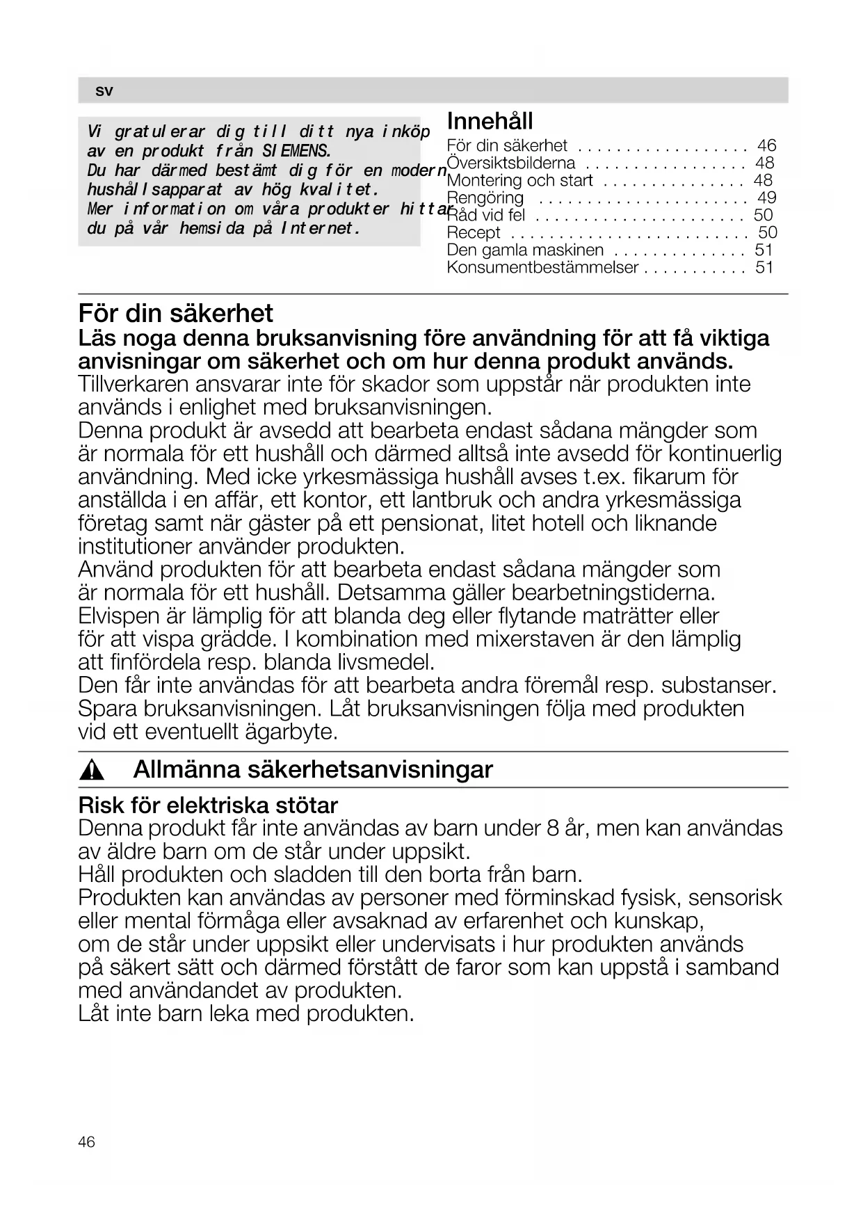 - Konsumentbestämmelser För din säkerhet Läs noga denna bruksanvisning före användning för att få viktiga anvisningar om säkerhet och om hur denna produkt används. Tillverkaren ansvarar inte för skador som uppstår när produkten inte används i enlighet med bruksanvisningen. Denna produkt är avsedd att bearbeta endast sådana mängder som är normala för ett hushåll och därmed alltså inte avsedd för kontinuerlig användning. Med icke yrkesmässiga hushåll avses t.ex. fikarum för anställda i en affär, ett kontor, ett lantbruk och andra yrkesmässiga företag samt när gäster på ett pensionat, litet hotell och liknande institutioner använder produkten. Använd produkten för att bearbeta endast sådana mängder som är normala för ett hushåll. Detsamma gäller bearbetningstiderna. Elvispen är lämplig för att blanda deg eller flytande maträtter eller för att vispa grädde. I kombination med mixerstaven är den lämplig att finfördela resp. blanda livsmedel. Den får inte användas för att bearbeta andra föremål resp. substanser. Spara bruksanvisningen. Låt bruksanvisningen följa med produkten vid ett eventuellt ägarbyte. , Allmänna säkerhetsanvisningar Risk för elektriska stötar Denna produkt får inte användas av barn under 8 år, men kan användas av äldre barn om de står under uppsikt. Håll produkten och sladden till den borta från barn. Produkten kan användas av personer med förminskad fysisk, sensorisk eller mental förmåga eller avsaknad av erfarenhet och kunskap, om de står under uppsikt eller undervisats i hur produkten används på säkert sätt och därmed förstått de faror som kan uppstå i samband med användandet av produkten. Låt inte barn leka med produkten. p. 51