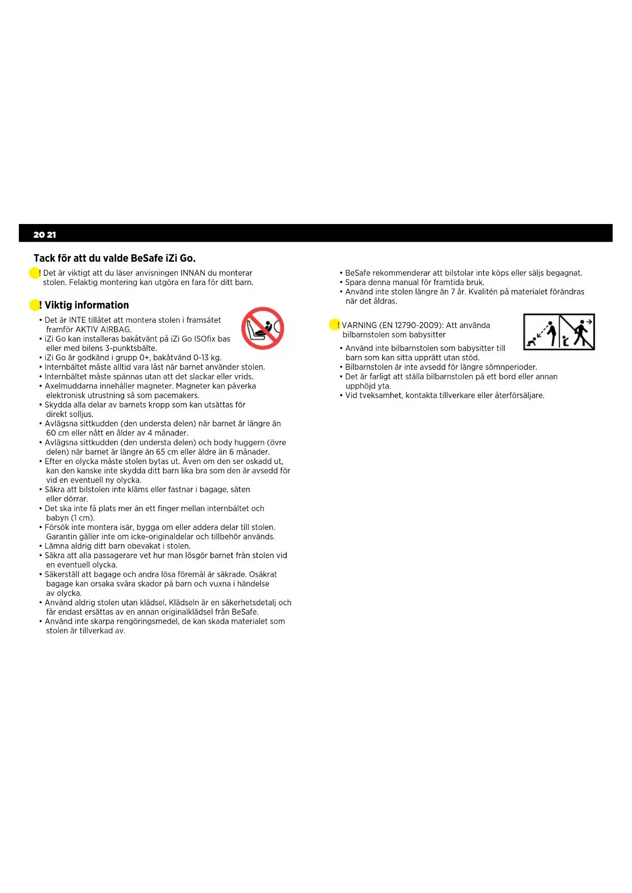 - Använd inte skarpa rengöringsmedel, de kan skada materialet som stolen är tillverkad av. Tack för att du valde BeSafe iZi Go. ! Det är viktigt att du läser anvisningen INNAN du monterar stolen. Felaktig montering kan utgöra en fara för ditt barn. ! VARNING (EN 12790-2009): Att använda bilbarnstolen som babysitter
