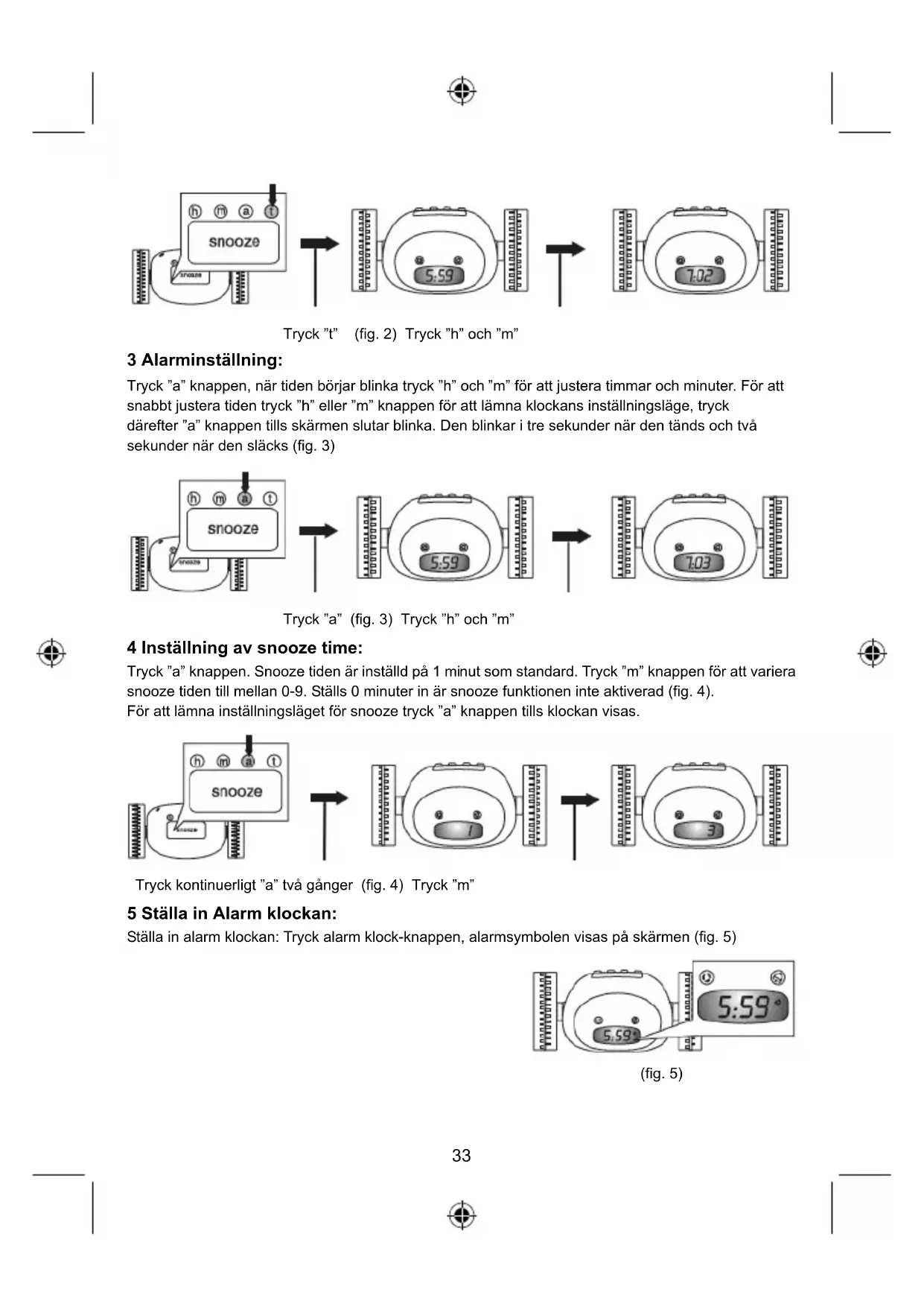 Tryck "a" knappen. Snooze tiden är inställd på 1 minut som standard. Tryck "m" knappen för att variera snooze tiden till mellan 0-9. Ställs 0 minuter in är snooze funktionen inte aktiverad (fig. 4). För att lämna inställningsläget för snooze tryck "a" knappen tills klockan visas.