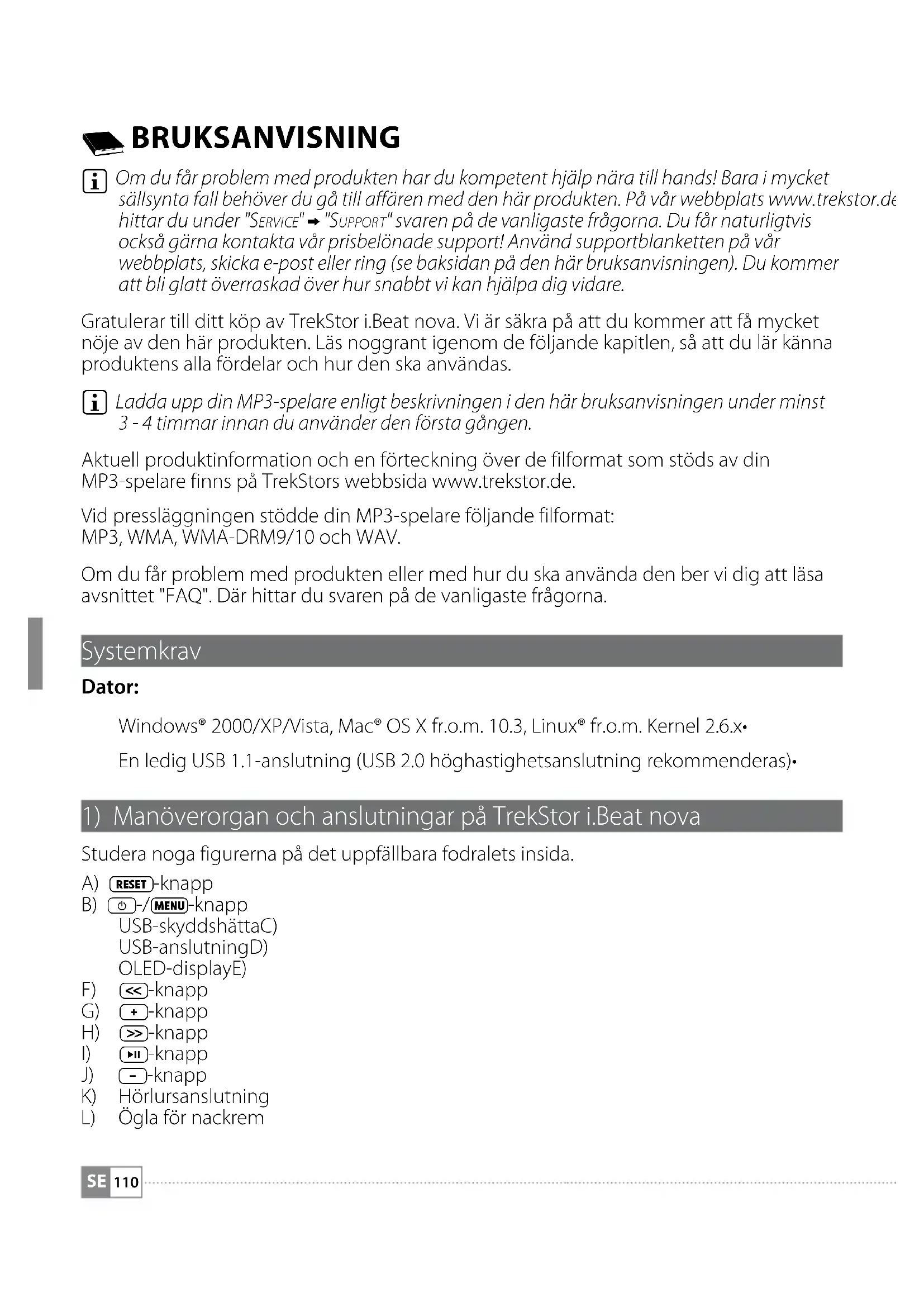 Om du får problem med produkten har du kompetent hjälp nära till hands! Bara i mycket sällsynta fall behöver du gå till affären med den här produkten. På vår webbplats www.trekstor.de hittar du under "Se r v i c e " + "Su p p o r t " svaren på de vanligaste frågorna. Du får naturligtvis också gärna kontakta vår prisbelönade support! Använd supportblanketten på vår webbplats, skicka e-post eller ring (se baksidan på den här bruksanvisningen). Du kommer att bli glatt överraskad över hur snabbt vi kan hjälpa dig vidare. Gratulerar till ditt köp av TrekStor i.Beat nova. Vi är säkra på att du kommer att få mycket nöje av den här produkten. Läs noggrant igenom de följande kapitlen, så att du lär känna produktens alla fördelar och hur den ska användas.