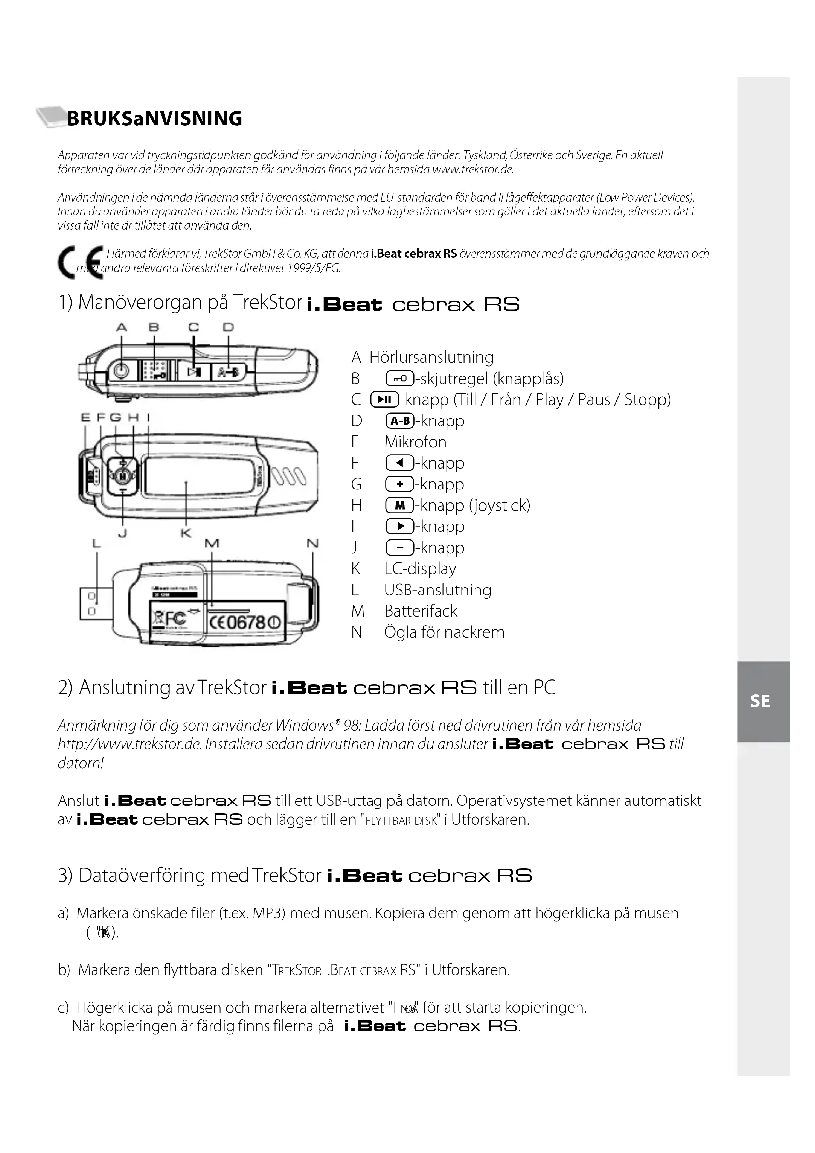 a) Markera önskade filer (t.ex. MP3) med musen. Kopiera dem genom att högerklicka på musen ("K o p i e r A "). b) Markera den flyttbara disken "t r e K st o r i.be A t c e b r A x rs" i Utforskaren. c) Högerklicka på musen och markera alternativet "i n f o g A " för att starta kopieringen. När kopieringen är färdig finns filerna på i.Beat cebrax RS. A Hörlursanslutning B -skjutregel (knapplås) C -knapp (Till / Från / Play / Paus / Stopp) D -knapp E Mikrofon F -knapp G -knapp H -knapp (joystick) I -knapp J -knapp K LC-display L USB-anslutning M Batterifack N Ögla för nackrem– 38 – – 39 –