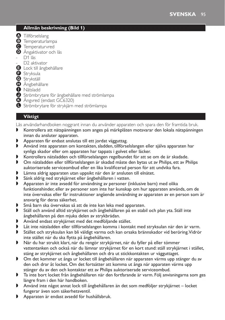 Tillförselslang Temperaturlampa Temperaturvred Ångaktivator och lås D1 lås D2 aktivator Lock till ångbehållare Stryksula Strykställ Ångbehållare Nätsladd Strömbrytare för ångbehållare med strömlampa Ångvred (endast GC6320) Strömbrytare för strykjärn med strömlampa Viktigt Läs användarhandboken noggrant innan du använder apparaten och spara den för framtida bruk. , Kontrollera att nätspänningen som anges på märkplåten motsvarar den lokala nätspänningen innan du ansluter apparaten. , Apparaten får endast anslutas till ett jordat vägguttag. , Använd inte apparaten om kontakten, sladden, tillförselslangen eller själva apparaten har synliga skador eller om apparaten har tappats i golvet eller läcker. , Kontrollera nätsladden och tillförselslangen regelbundet för att se om de är skadade. , Om nätsladden eller tillförselslangen är skadad måste den bytas ut av Philips, ett av Philips auktoriserade serviceombud eller en lika kvalificerad person för att undvika fara. , Lämna aldrig apparaten utan uppsikt när den är ansluten till elnätet. , Sänk aldrig ned strykjärnet eller ångbehållaren i vatten. , Apparaten är inte avsedd för användning av personer (inklusive barn) med olika funktionshinder, eller av personer som inte har kunskap om hur apparaten används, om de inte övervakas eller får instruktioner angående användning av apparaten av en person som är ansvarig för deras säkerhet. , Små barn ska övervakas så att de inte kan leka med apparaten. , Ställ och använd alltid strykjärnet och ångbehållaren på en stabil och plan yta. Ställ inte ångbehållaren på den mjuka delen av strykbrädan. , Använd endast strykjärnet med det medföljande stället. , Låt inte nätsladden eller tillförselslangen komma i kontakt med stryksulan när den är varm. , Stället och stryksulan kan bli väldigt varma och kan orsaka brännskador vid beröring.Vidrör inte stället när du ska flytta på ångbehållaren. , När du har strukit klart, när du rengör strykjärnet, när du fyller på eller tömmer vattentanken och också när du lämnar strykjärnet för en kort stund: ställ strykjärnet i stället, stäng av strykjärnet och ångbehållaren och dra ut stickkontakten ur vägguttaget. , Om det kommer ut ånga ur locket till ångbehållaren när apparaten värms upp stänger du av den och drar åt locket. Om det fortsätter att komma ut ånga när apparaten värms upp stänger du av den och kontaktar ett av Philips auktoriserade serviceombud. , Ta inte bort locket från ångbehållaren när den fortfarande är varm. Följ anvisningarna som ges längre fram i den här handboken. , Använd inte något annat lock till ångbehållaren än det som medföljer strykjärnet – locket fungerar även som säkerhetsventil. , Apparaten är endast avsedd för hushållsbruk.