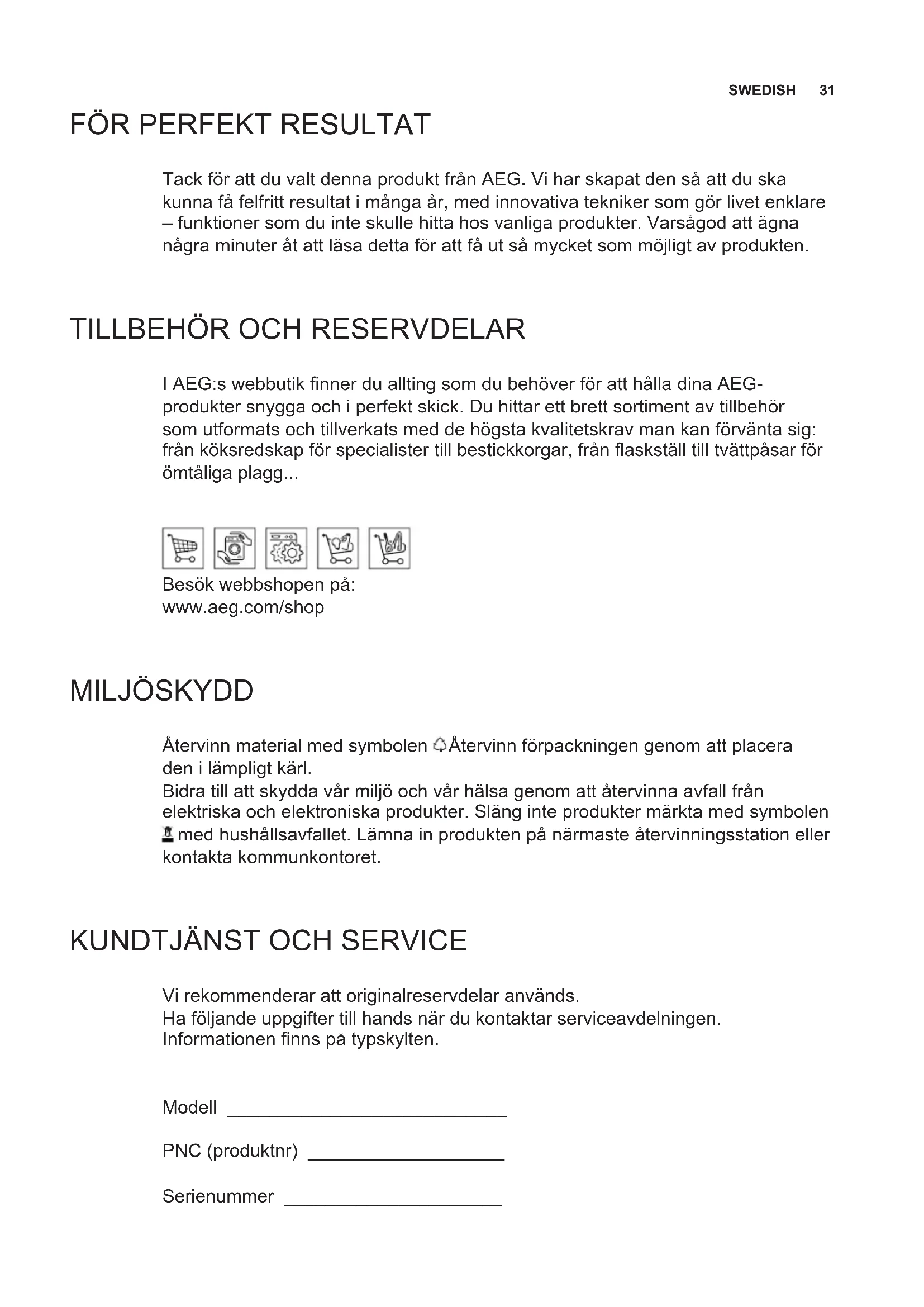 I AEG:s webbutik nner du allting som du behöver för att hålla dina AEG- produkter snygga och i perfekt skick. Du hittar ett brett sortiment av tillbehör som utformats och tillverkats med de högsta kvalitetskrav man kan förvänta sig: från köksredskap för specialister till bestickkorgar, från askställ till tvättpåsar för ömtåliga plagg... Besök webbshopen på: www.aeg.com/shop MILJÖSKYDD Återvinn material med symbolen . Återvinn förpackningen genom att placera den i lämpligt kärl. Bidra till att skydda vår miljö och vår hälsa genom att återvinna avfall från elektriska och elektroniska produkter. Släng inte produkter märkta med symbolen med hushållsavfallet. Lämna in produkten på närmaste återvinningsstation eller kontakta kommunkontoret.
