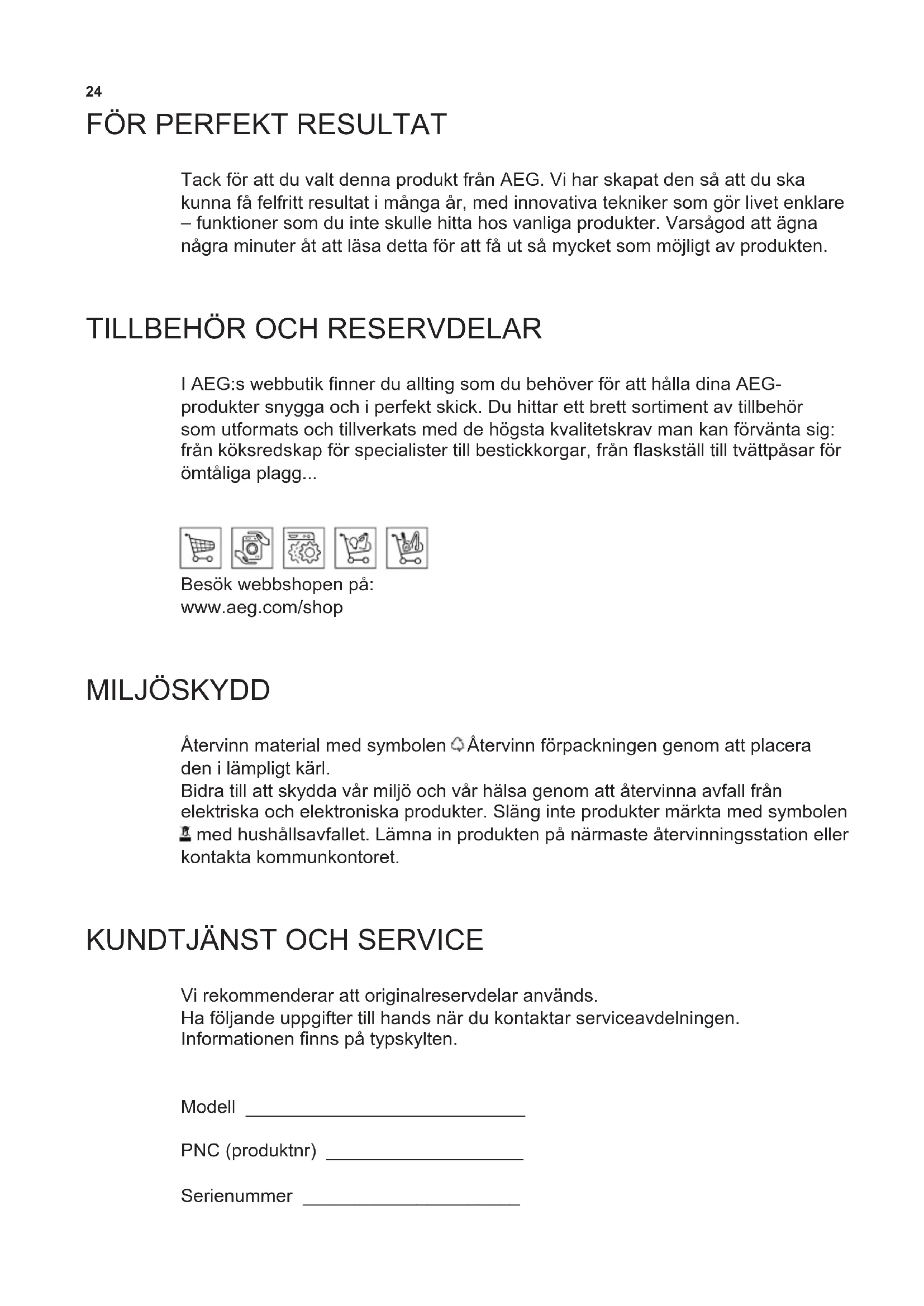 I AEG:s webbutik nner du allting som du behöver för att hålla dina AEG- produkter snygga och i perfekt skick. Du hittar ett brett sortiment av tillbehör som utformats och tillverkats med de högsta kvalitetskrav man kan förvänta sig: från köksredskap för specialister till bestickkorgar, från askställ till tvättpåsar för ömtåliga plagg... Besök webbshopen på: www.aeg.com/shop MILJÖSKYDD Återvinn material med symbolen . Återvinn förpackningen genom att placera den i lämpligt kärl. Bidra till att skydda vår miljö och vår hälsa genom att återvinna avfall från elektriska och elektroniska produkter. Släng inte produkter märkta med symbolen med hushållsavfallet. Lämna in produkten på närmaste återvinningsstation eller kontakta kommunkontoret.