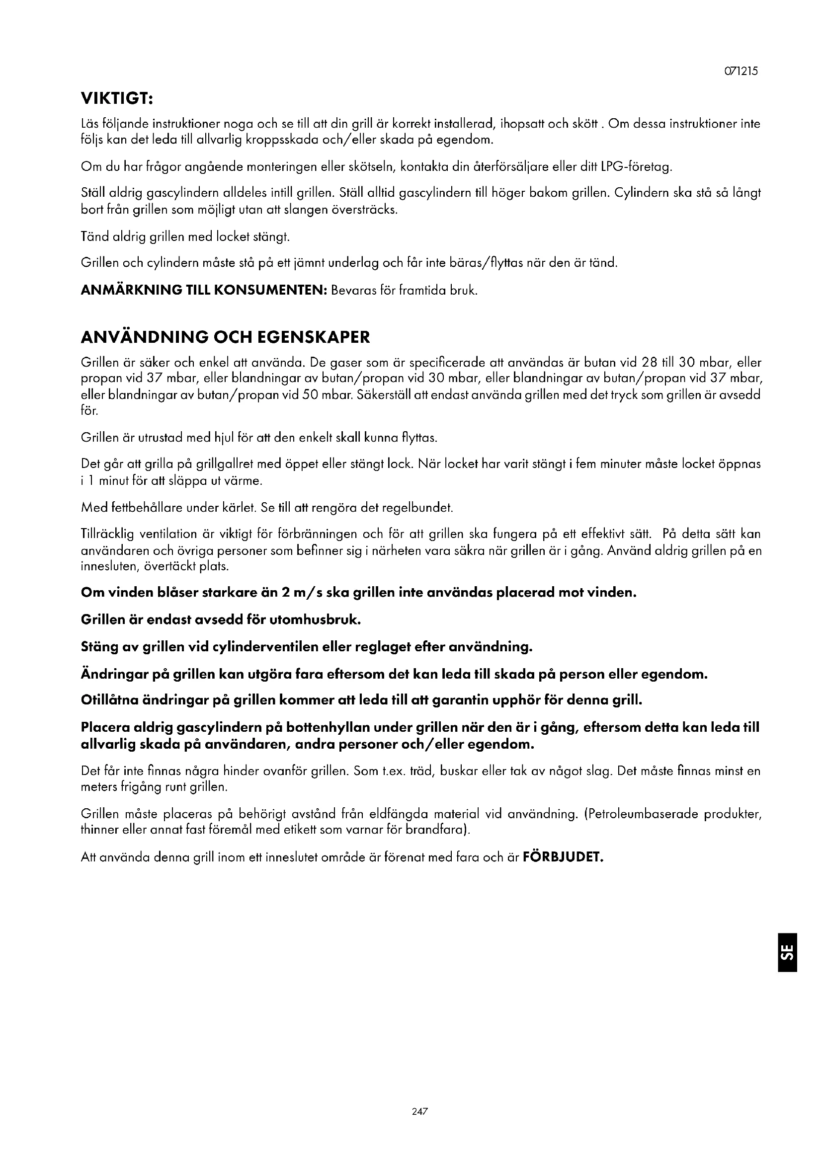 Grillen är säker och enkel att använda. De gaser som är specificerade att användas är butan vid 28 till 30 mbar, eller propan vid 37 mbar, eller blandningar av butan/propan vid 30 mbar, eller blandningar av butan/propan vid 37 mbar, eller blandningar av butan/propan vid 50 mbar. Säkerställ att endast använda grillen med det tryck som grillen är avsedd för. Grillen är utrustad med hjul för att den enkelt skall kunna flyttas. Det går att grilla på grillgallret med öppet eller stängt lock. När locket har varit stängt i fem minuter måste locket öppnas i 1 minut för att släppa ut värme. Med fettbehållare under kärlet. Se till att rengöra det regelbundet. Tillräcklig ventilation är viktigt för förbränningen och för att grillen ska fungera på ett effektivt sätt. På detta sätt kan användaren och övriga personer som befinner sig i närheten vara säkra när grillen är i gång. Använd aldrig grillen på en innesluten, övertäckt plats. Om vinden blåser starkare än 2 m/s ska grillen inte användas placerad mot vinden. Grillen är endast avsedd för utomhusbruk. Stäng av grillen vid cylinderventilen eller reglaget efter användning. Ändringar på grillen kan utgöra fara eftersom det kan leda till skada på person eller egendom. Otillåtna ändringar på grillen kommer att leda till att garantin upphör för denna grill. Placera aldrig gascylindern på bottenhyllan under grillen när den är i gång, eftersom detta kan leda till allvarlig skada på användaren, andra personer och/eller egendom. Det får inte finnas några hinder ovanför grillen. Som t.ex. träd, buskar eller tak av något slag. Det måste finnas minst en meters frigång runt grillen. Grillen måste placeras på behörigt avstånd från eldfängda material vid användning. (Petroleumbaserade produkter, thinner eller annat fast föremål med etikett som varnar för brandfara). Att använda denna grill inom ett inneslutet område är förenat med fara och är FÖRBJUDET. SE248
