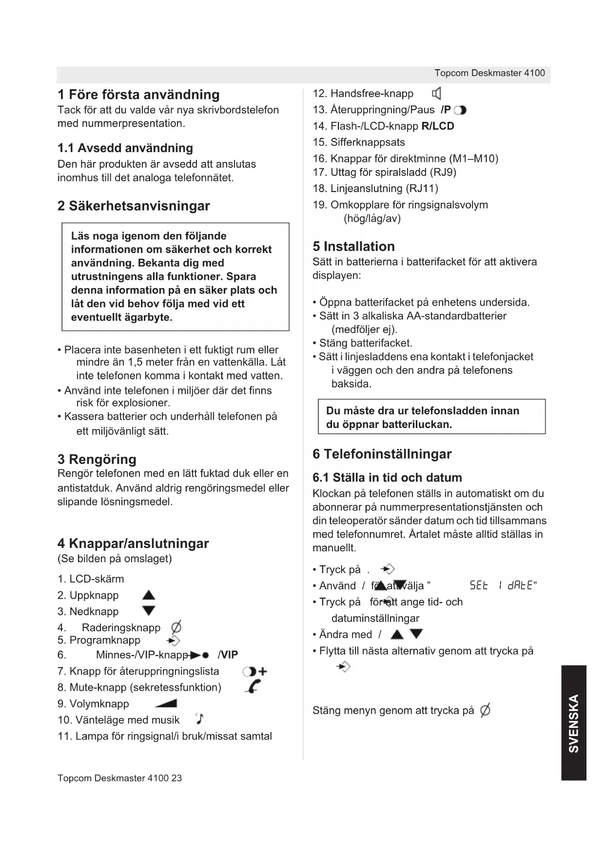- Flytta till nästa alternativ genom att trycka på Stäng menyn genom att trycka på Läs noga igenom den följande informationen om säkerhet och korrekt användning. Bekanta dig med utrustningens alla funktioner. Spara denna information på en säker plats och låt den vid behov följa med vid ett eventuellt ägarbyte. Du måste dra ur telefonsladden innan du öppnar batteriluckan.24 Topcom Deskmaster 4100 Topcom Deskmaster 4100