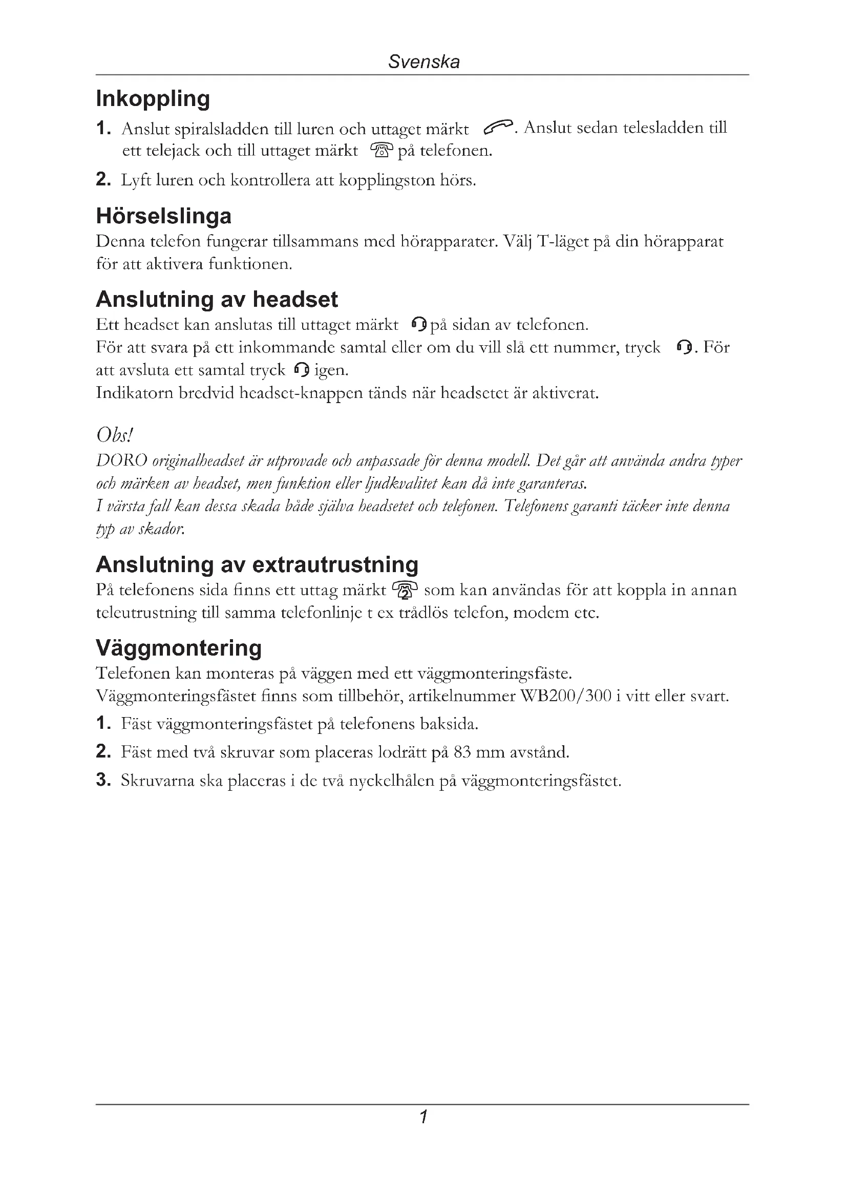 igen. Indikatorn bredvid headset-knappen tänds när headsetet är aktiverat. Obs! DORO originalheadset är utprovade och anpassade för denna modell. Det går att använda andra typer och märken av headset, men funktion eller ljudkvalitet kan då inte garanteras. I värsta fall kan dessa skada både själva headsetet och telefonen. Telefonens garanti täcker inte denna typ av skador. Anslutning av extrautrustning På telefonens sida nns ett uttag märkt 8 som kan användas för att koppla in annan teleutrustning till samma telefonlinje t ex trådlös telefon, modem etc. Väggmontering Telefonen kan monteras på väggen med ett väggmonteringsfäste. Väggmonteringsfästet nns som tillbehör, artikelnummer WB200/300 i vitt eller svart.