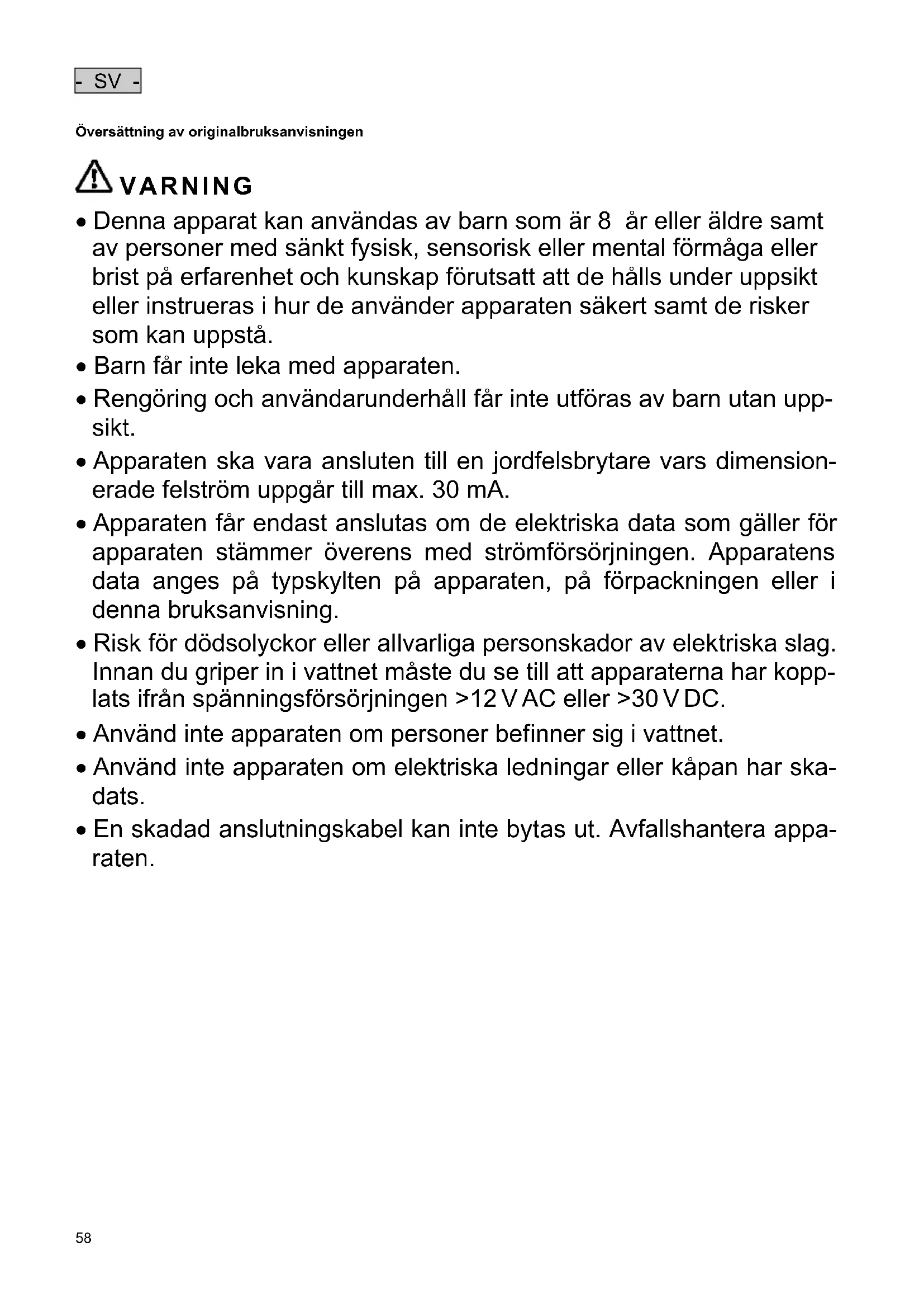 - Risk för dödsolyckor eller allvarliga personskador av elektriska slag. Innan du griper in i vattnet måste du se till att apparaterna har kopp- lats ifrån spänningsförsörjningen >12 V AC eller >30 V DC.