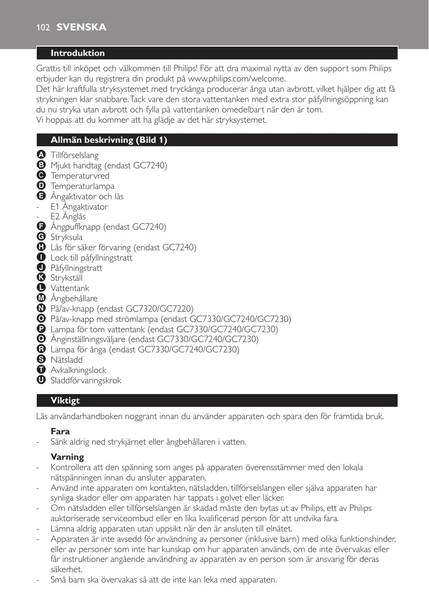 Tillförselslang Mjukt handtag (endast GC7240) Temperaturvred Temperaturlampa Ångaktivator och lås E1 Ångaktivator E2 Ånglås Ångpuffknapp (endast GC7240) Stryksula Lås för säker förvaring (endast GC7240) Lock till påfyllningstratt Påfyllningstratt Strykställ Vattentank Ångbehållare På/av-knapp (endast GC7320/GC7220) På/av-knapp med strömlampa (endast GC7330/GC7240/GC7230) Lampa för tom vattentank (endast GC7330/GC7240/GC7230) Ånginställningsväljare (endast GC7330/GC7240/GC7230) Lampa för ånga (endast GC7330/GC7240/GC7230) Nätsladd Avkalkningslock Sladdförvaringskrok Viktigt Läs användarhandboken noggrant innan du använder apparaten och spara den för framtida bruk.