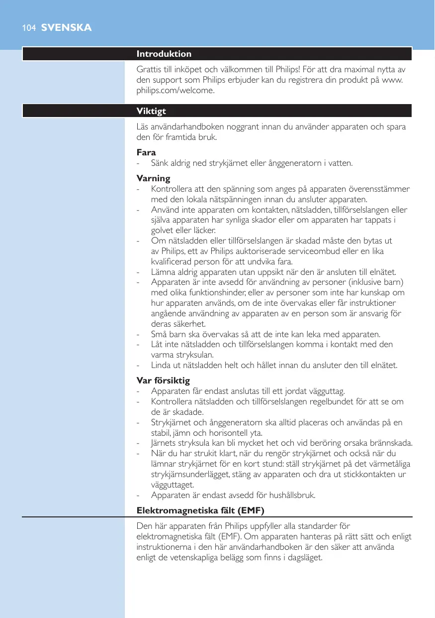 Não deite fora o aparelho junto com o lixo doméstico normal no final da sua vida útil; entregue-o num ponto de recolha oficial para reciclagem. Ao fazê-lo ajuda a preservar o ambiente. Garantia e assistência Se necessitar de reparações, informações ou se tiver problemas, visite o Web site da Philips em www.philips.pt ou contacte o Centro de Assistência ao Consumidor local (pode encontrar o número de telefone no folheto de garantia mundial). Se não existir um Centro de Assistência no seu país, visite o seu representante Philips local. 104 Svenska Introduktion Grattis till inköpet och välkommen till Philips! För att dra maximal nytta av den support som Philips erbjuder kan du registrera din produkt på www. philips.com/welcome. Viktigt Läs användarhandboken noggrant innan du använder apparaten och spara den för framtida bruk. Fara - Sänk aldrig ned strykjärnet eller ånggeneratorn i vatten. Varning - Kontrollera att den spänning som anges på apparaten överensstämmer med den lokala nätspänningen innan du ansluter apparaten. - Använd inte apparaten om kontakten, nätsladden, tillförselslangen eller själva apparaten har synliga skador eller om apparaten har tappats i golvet eller läcker. - Om nätsladden eller tillförselslangen är skadad måste den bytas ut av Philips, ett av Philips auktoriserade serviceombud eller en lika kvalificerad person för att undvika fara. - Lämna aldrig apparaten utan uppsikt när den är ansluten till elnätet. - Apparaten är inte avsedd för användning av personer (inklusive barn) med olika funktionshinder, eller av personer som inte har kunskap om hur apparaten används, om de inte övervakas eller får instruktioner angående användning av apparaten av en person som är ansvarig för deras säkerhet. - Små barn ska övervakas så att de inte kan leka med apparaten. - Låt inte nätsladden och tillförselslangen komma i kontakt med den varma stryksulan. - Linda ut nätsladden helt och hållet innan du ansluter den till elnätet. Var försiktig - Apparaten får endast anslutas till ett jordat vägguttag. - Kontrollera nätsladden och tillförselslangen regelbundet för att se om de är skadade. - Strykjärnet och ånggeneratorn ska alltid placeras och användas på en stabil, jämn och horisontell yta. - Järnets stryksula kan bli mycket het och vid beröring orsaka brännskada. - När du har strukit klart, när du rengör strykjärnet och också när du lämnar strykjärnet för en kort stund: ställ strykjärnet på det värmetåliga strykjärnsunderlägget, stäng av apparaten och dra ut stickkontakten ur vägguttaget. - Apparaten är endast avsedd för hushållsbruk. Elektromagnetiska fält (EMF) Den här apparaten från Philips uppfyller alla standarder för elektromagnetiska fält (EMF). Om apparaten hanteras på rätt sätt och enligt instruktionerna i den här användarhandboken är den säker att använda enligt de vetenskapliga belägg som finns i dagsläget. Svenska 105 Allmän beskrivning (Bild 1)