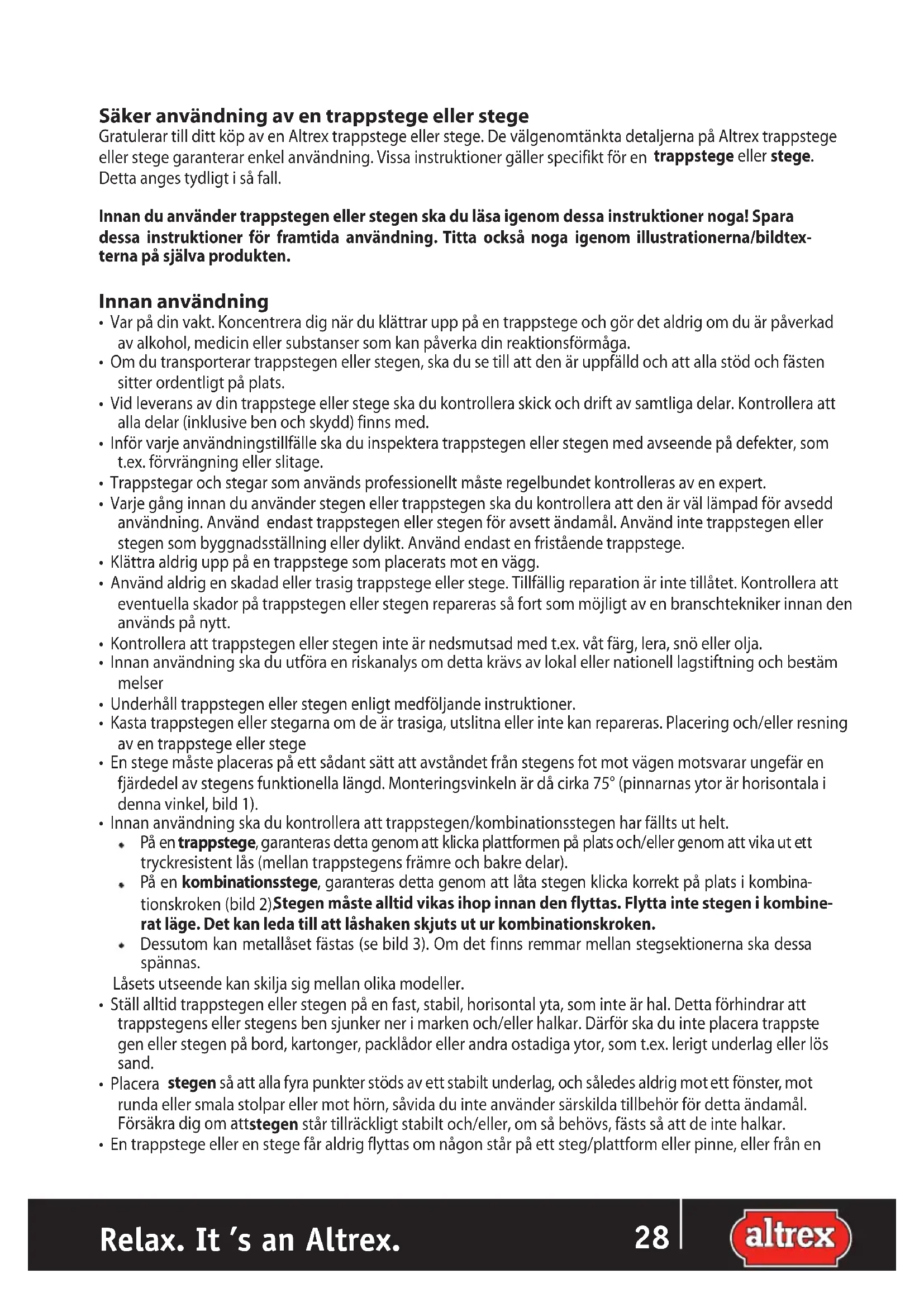 Relax. It ’s an Altrex. ITSäker användning av en trappstege eller stege Gratulerar till ditt köp av en Altrex trappstege eller stege. De välgenomtänkta detaljerna på Altrex trappstege eller stege garanterar enkel användning. Vissa instruktioner gäller specifikt för en trappstege eller stege. Detta anges tydligt i så fall. Innan du använder trappstegen eller stegen ska du läsa igenom dessa instruktioner noga! Spara dessa instruktioner för framtida användning. Titta också noga igenom illustrationerna/bildtex- terna på själva produkten. Innan användning