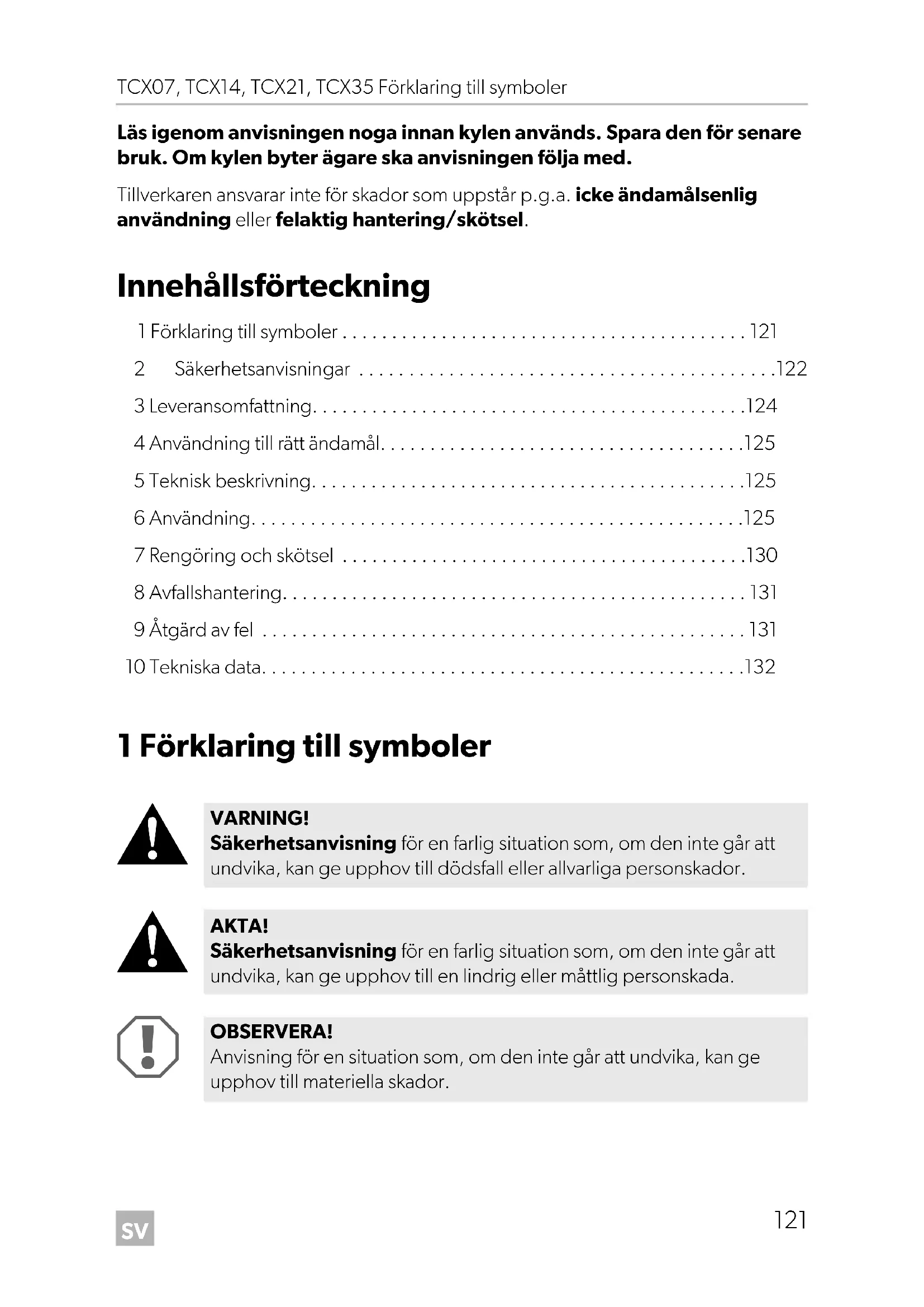 VARNING! Säkerhetsanvisning för en farlig situation som, om den inte går att undvika, kan ge upphov till dödsfall eller allvarliga personskador. AKTA! Säkerhetsanvisning för en farlig situation som, om den inte går att undvika, kan ge upphov till en lindrig eller måttlig personskada. OBSERVERA! Anvisning för en situation som, om den inte går att undvika, kan ge upphov till materiella skador. TCX07-TCX35-OPM-EMEA16.book Seite 121 Donnerstag, 11. Juli 2019 12:20 12SV Säkerhetsanvisningar TCX07, TCX14, TCX21, TCX35