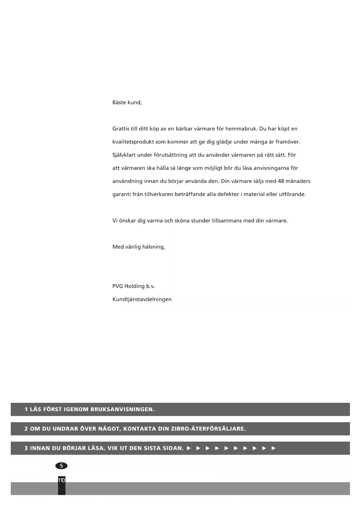 Plaats de gevulde wisseltank terug. Plaats de batterijen in de batterijhouder (let op de plus en min). Na het plaatsen van de wisseltank en de batterijen, moet u 30 minuten wachten voordat u de kachel aanmaakt. 100 cm 150 cm 50 cm 50 cm 20 cm 50 cm p98_109_nl_R224TC.indd 109 03-06-13 13:41Bäste kund, Grattis till ditt köp av en bärbar värmare för hemmabruk. Du har köpt en kvalitetsprodukt som kommer att ge dig glädje under många år framöver. Självklart under förutsättning att du använder värmaren på rätt sätt. För att värmaren ska hålla så länge som möjligt bör du läsa anvisningarna för användning innan du börjar använda den. Din värmare säljs med 48 månaders garanti från tillverkaren beträffande alla defekter i material eller utförande. Vi önskar dig varma och sköna stunder tillsammans med din värmare. Med vänlig hälsning, PVG Holding b.v. Kundtjänstavdelningen 1 LÄS FÖRST IGENOM BRUKSANVISNINGEN. 2 OM DU UNDRAR ÖVER NÅGOT, KONTAKTA DIN ZIBRO-ÅTERFÖRSÄLJARE. 3 INNAN DU BÖRJAR LÄSA, VIK UT DEN SISTA SIDAN. e e e e e e e e e e