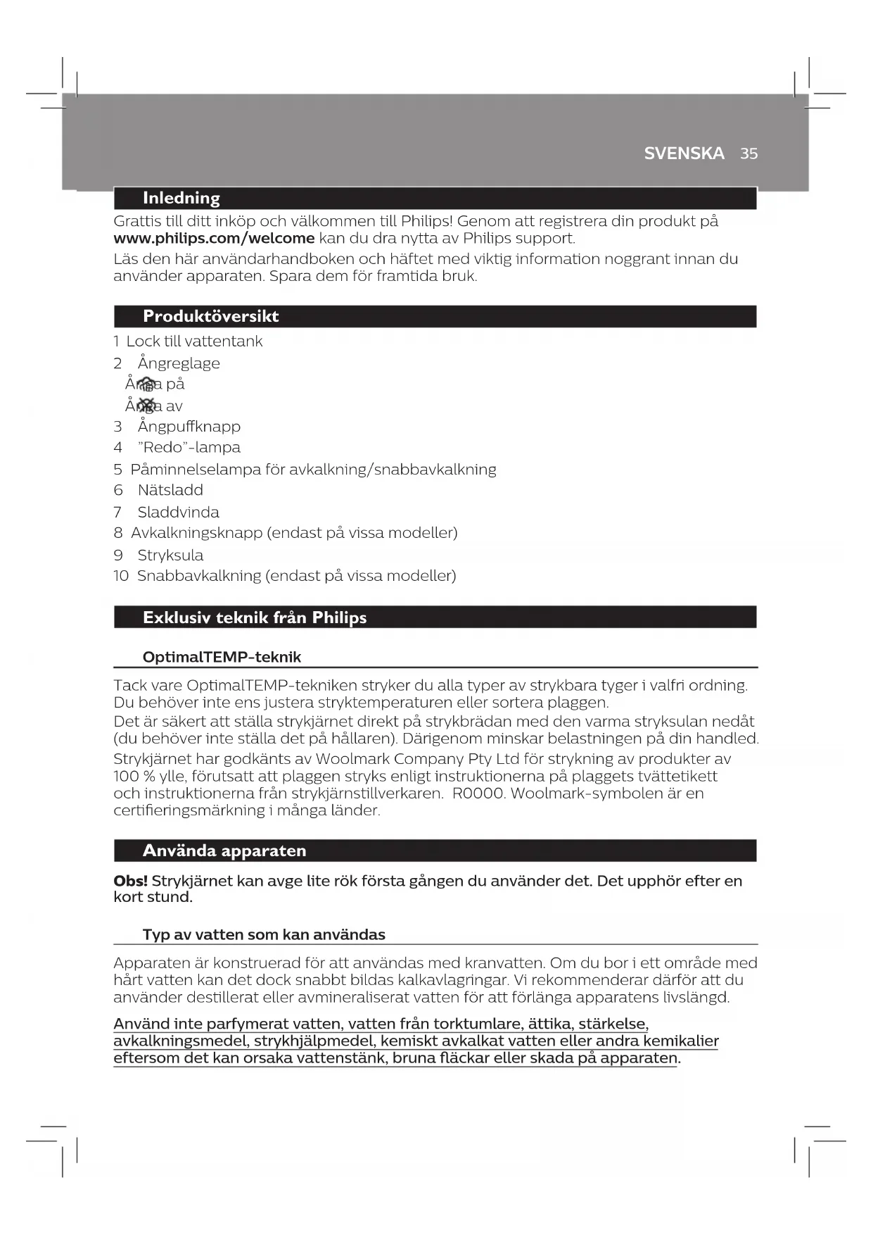 Strykjärnet avger inte någon ånga. Det nns inte tillräckligt med vatten i tanken. Fyll vattentanken. Ångreglaget är inställt på . Ställ in ångläget på . Strykjärnet har inte blivit tillräckligt varmt för att avge ånga. Vänta tills ”redo”-lampan har slutat blinka och lyser med ett fast sken. Det droppar vatten på plagget under strykningen. Du har använt ångpuknappen för mycket. Fortsätt att stryka i horisontellt läge och vänta en stund innan du använder ångpusfunktionen igen. Du har inte stängt locket till vattentanken ordentligt. Tryck på locket tills du hör ett klickljud. Du har inte satt tillbaka snabbavkalkningsuppsamlaren ordentligt i apparaten (endast på vissa modeller). Avbryt strykningen och låt strykjärnet svalna i minst en timme. Ta ut snabbavkalkningsuppsamlaren. Sätt tillbaka uppsamlaren i apparaten och se till att den är i linje med apparatens yta. Tryck ned iken tills du hör ett klickljud. Om snabbavkalkningsuppsamlaren skadas kontaktar du kundtjänst i ditt land (kontaktuppgifter nns i garantihäftet). Strykjärnet avger inte någon ångpu. Du har använt ångpuknappen för mycket. Fortsätt att stryka i horisontellt läge och vänta en stund innan du använder ångpusfunktionen igen. Strykjärnet har inte blivit tillräckligt varmt för strykning. Vänta tills ”redo”-lampan har slutat blinka och lyser med ett fast sken. Du har tillsatt en kemikalie i vattentanken. Skölj vattentanken – tillsätt inte någon parfym eller kemikalie efteråt. Det kommer smutsigt vatten eller annan smuts ur stryksulan vid strykning. Hårt vatten med smuts eller kemikalier har bildat agor inne i stryksulan. Utför snabbavkalkning (endast på vissa modeller) eller avkalkning (endast på vissa modeller). Se kapitlet Rengöring och underhåll. Det droppar vatten från stryksulan när strykjärnets nätsladd har dragits ut. Strykjärnet står i horisontalläge och har fortfarande vatten i vattentanken. Töm vattentanken efter användning eller förvara strykjärnet i vertikalt läge. Ångreglaget är inställt på . Ställ in ångreglaget på . En gul lampa blinkar på strykjärnets handtag. Avkalkningspåminnelselampan har aktiverats. Den påminner dig om att avkalka strykjärnet. Utför snabbavkalkning (endast på vissa modeller) eller avkalkning (endast på vissa modeller). Se kapitlet Rengöring och underhåll. Strykjärnet lämnar glans eller avtryck på plagget. Ytan som skulle strykas var ojämn, till exempel eftersom du strök över en söm eller ett veck i plagget. Strykjärnet kan användas på alla strykbara plagg. Glansen eller avtrycket som strykjärnet efterlämnar är inte permanent utan försvinner när du tvättar plagget. Undvik att stryka över sömmar och veck. Lägg en tygbit av bomull över området som ska strykas om du vill undvika avtryck.39