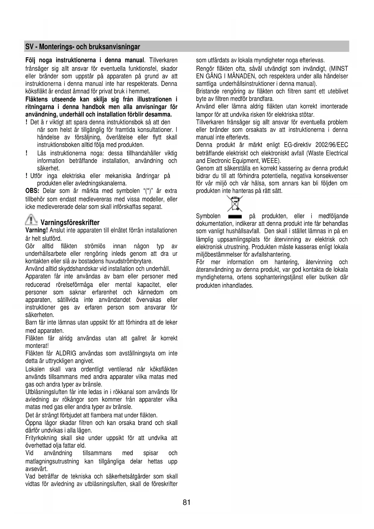 Dersom belysningen ikke skulle virke, kontroller at lyspærene er satt korrekt på plass før du henvender deg til teknisk assistanse.81 SV - Monterings- och bruksanvisningar Följ noga instruktionerna i denna manual. Tillverkaren frånsäger sig allt ansvar för eventuella funktionsfel, skador eller bränder som uppstår på apparaten på grund av att instruktionerna i denna manual inte har respekterats. Denna köksfläkt är endast ämnad för privat bruk i hemmet. Fläktens utseende kan skilja sig från illustrationen i ritningarna i denna handbok men alla anvisningar för användning, underhåll och installation förblir desamma. ! Det ä r viktigt att spara denna instruktionsbok så att den när som helst är tillgänglig för framtida konsultationer. I händelse av försäljning, överlåtelse eller flytt skall instruktionsboken alltid följa med produkten. ! Läs instruktionerna noga: dessa tillhandahåller viktig information beträffande installation, användning och säkerhet. ! Utför inga elektriska eller mekaniska ändringar på produkten eller avledningskanalerna. OBS: Delar som är märkta med symbolen “(*)” är extra tillbehör som endast medlevereras med vissa modeller, eller icke medlevererade delar som skall införskaffas separat. Varningsföreskrifter Varning! Anslut inte apparaten till elnätet förrän installationen är helt slutförd. Gör alltid fläkten strömlös innan någon typ av underhållsarbete eller rengöring inleds genom att dra ur kontakten eller slå av bostadens huvudströmbrytare. Använd alltid skyddshandskar vid installation och underhåll. Apparaten får inte användas av barn eller personer med reducerad rörelseförmåga eller mental kapacitet, eller personer som saknar erfarenhet och kännedom om apparaten, såtillvida inte användandet övervakas eller instruktioner ges av erfaren person som ansvarar för säkerheten. Barn får inte lämnas utan uppsikt för att förhindra att de leker med apparaten. Fläkten får alridg användas utan att gallret är korrekt monterat! Fläkten får ALDRIG användas som avställningsyta om inte detta är uttryckligen angivet. Lokalen skall vara ordentligt ventilerad när köksfläkten används tillsammans med andra apparater vilka matas med gas och andra typer av bränsle. Utblåsningsluften får inte ledas in i rökkanal som används för avledning av rökångor som kommer från apparater vilka matas med gas eller andra typer av bränsle. Det är strängt förbjudet att flambera mat under fläkten. Öppna lågor skadar filtren och kan orsaka brand och skall därför undvikas i alla lägen. Frityrkokning skall ske under uppsikt för att undvika att överhettad olja fattar eld. Vid användning tillsammans med spisar och matlagningsutrustning kan tillgängliga delar hettas upp avsevärt. Vad beträffar de tekniska och säkerhetsåtgärder som skall vidtas för avledning av utblåsningsluften, skall de föreskrifter som utfärdats av lokala myndigheter noga efterlevas. Rengör fläkten ofta, såväl utvändigt som invändigt, (MINST EN GÅNG I MÅNADEN, och respektera under alla händelser samtliga underhållsinstruktioner i denna manual). Bristande rengöring av fläkten och filtren samt ett uteblivet byte av filtren medför brandfara. Använd eller lämna aldrig fläkten utan korrekt imonterade lampor för att undvika risken för elektriska stötar. Tillverkaren frånsäger sig allt ansvar för eventuella problem eller bränder som orsakats av att instruktionerna i denna manual inte efterlevts. Denna produkt är märkt enligt EG-direktiv 2002/96/EEC beträffande elektriskt och elektroniskt avfall (Waste Electrical and Electronic Equipment, WEEE). Genom att säkerställa en korrekt kassering av denna produkt bidrar du till att förhindra potentiella, negativa konsekvenser för vår miljö och vår hälsa, som annars kan bli följden om produkten inte hanteras på rätt sätt. Symbolen på produkten, eller i medföljande dokumentation, indikerar att denna produkt inte får behandlas som vanligt hushållsavfall. Den skall i stället lämnas in på en lämplig uppsamlingsplats för återvinning av elektrisk och elektronisk utrustning. Produkten måste kasseras enligt lokala miljöbestämmelser för avfallshantering. För mer information om hantering, återvinning och återanvändning av denna produkt, var god kontakta de lokala myndigheterna, ortens sophanteringstjänst eller butiken där produkten inhandlades.82 Användning Fläkten har tillverkats för att användas som utsugningsversion med utvändig evakuering eller som filterversion med intern återcirkulation. Utsugningsversion Matoset leds ut ur lokalen med hjälp av ett avledningsrör som är fixerat på anslutningsflänsen. Avledningsröret skall ha samma diameter som anslutningsflänsen. Varning! Avledningsröret medlevereras inte och skall införskaffas separat. Röret skall, även när det är horisontellt draget, alltid luta lätt (cirka 10°) uppåt, så att luften lätt kan ledas ut ur lokalen. I det fall fläkten är försedd med kolfilter skall dessa tas ur. Rören och utloppsöppningarna i väggen med vilka fläkten skall anslutas bör ha samma diameter som luftutsläppet (anslutningsflänsen). I det fall man använder rör och utloppsöppningar i väggen med mindre diameter medför detta en lägre utblåsprestanda och en drastisk förhöjning av bullernivån. Vi avsäger oss därför allt ansvar gällande denna typ av problem. ! Använd ett så kort rör som möjligt. ! Röret skall vara så rakt som möjligt (högsta tillåtna vinkel på böjarna 90°). ! Undvik stora skillnader i rörets tvärsnittsarea. ! Använd rör vars insida är så slät som möjligt. ! Röret skall vara tillverkat av i lag godkända material. Filterversion Den utsugna luften avfettas och befrias från odörer innan den leds ut i lokalen igen. När fläkten används med denna version är det nödvändigt att installera ett extra aktivt kolfiltersystem. De modeller s
