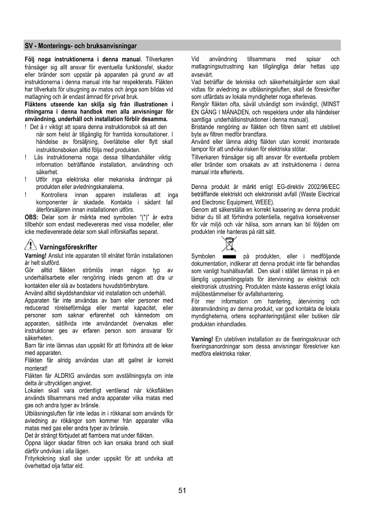 Για την αντικατάσταση τους, απευθυνθείτε στην υπηρεσία τεχνικής βοήθειας51 SV - Monterings- och bruksanvisningar Följ noga instruktionerna i denna manual. Tillverkaren frånsäger sig allt ansvar för eventuella funktionsfel, skador eller bränder som uppstår på apparaten på grund av att instruktionerna i denna manual inte har respekterats. Fläkten har tillverkats för utsugning av matos och ånga som bildas vid matlagning och är endast ämnad för privat bruk. Fläktens utseende kan skilja sig från illustrationen i ritningarna i denna handbok men alla anvisningar för användning, underhåll och installation förblir desamma. ! Det ä r viktigt att spara denna instruktionsbok så att den när som helst är tillgänglig för framtida konsultationer. I händelse av försäljning, överlåtelse eller flytt skall instruktionsboken alltid följa med produkten. ! Läs instruktionerna noga: dessa tillhandahåller viktig information beträffande installation, användning och säkerhet. ! Utför inga elektriska eller mekaniska ändringar på produkten eller avledningskanalerna. ! Kontrollera innan apparen installeras att inga komponenter är skadade. Kontakta i sådant fall återförsäljaren innan installationen utförs. OBS: Delar som är märkta med symbolen “(*)” är extra tillbehör som endast medlevereras med vissa modeller, eller icke medlevererade delar som skall införskaffas separat. Varningsföreskrifter Varning! Anslut inte apparaten till elnätet förrän installationen är helt slutförd. Gör alltid fläkten strömlös innan någon typ av underhållsarbete eller rengöring inleds genom att dra ur kontakten eller slå av bostadens huvudströmbrytare. Använd alltid skyddshandskar vid installation och underhåll. Apparaten får inte användas av barn eller personer med reducerad rörelseförmåga eller mental kapacitet, eller personer som saknar erfarenhet och kännedom om apparaten, såtillvida inte användandet övervakas eller instruktioner ges av erfaren person som ansvarar för säkerheten. Barn får inte lämnas utan uppsikt för att förhindra att de leker med apparaten. Fläkten får alridg användas utan att gallret är korrekt monterat! Fläkten får ALDRIG användas som avställningsyta om inte detta är uttryckligen angivet. Lokalen skall vara ordentligt ventilerad när köksfläkten används tillsammans med andra apparater vilka matas med gas och andra typer av bränsle. Utblåsningsluften får inte ledas in i rökkanal som används för avledning av rökångor som kommer från apparater vilka matas med gas eller andra typer av bränsle. Det är strängt förbjudet att flambera mat under fläkten. Öppna lågor skadar filtren och kan orsaka brand och skall därför undvikas i alla lägen. Frityrkokning skall ske under uppsikt för att undvika att överhettad olja fattar eld. Vid användning tillsammans med spisar och matlagningsutrustning kan tillgängliga delar hettas upp avsevärt. Vad beträffar de tekniska och säkerhetsåtgärder som skall vidtas för avledning av utblåsningsluften, skall de föreskrifter som utfärdats av lokala myndigheter noga efterlevas. Rengör fläkten ofta, såväl utvändigt som invändigt, (MINST EN GÅNG I MÅNADEN, och respektera under alla händelser samtliga underhållsinstruktioner i denna manual). Bristande rengöring av fläkten och filtren samt ett uteblivet byte av filtren medför brandfara. Använd eller lämna aldrig fläkten utan korrekt imonterade lampor för att undvika risken för elektriska stötar. Tillverkaren frånsäger sig allt ansvar för eventuella problem eller bränder som orsakats av att instruktionerna i denna manual inte efterlevts. Denna produkt är märkt enligt EG-direktiv 2002/96/EEC beträffande elektriskt och elektroniskt avfall (Waste Electrical and Electronic Equipment, WEEE). Genom att säkerställa en korrekt kassering av denna produkt bidrar du till att förhindra potentiella, negativa konsekvenser för vår miljö och vår hälsa, som annars kan bli följden om produkten inte hanteras på rätt sätt. Symbolen på produkten, eller i medföljande dokumentation, indikerar att denna produkt inte får behandlas som vanligt hushållsavfall. Den skall i stället lämnas in på en lämplig uppsamlingsplats för återvinning av elektrisk och elektronisk utrustning. Produkten måste kasseras enligt lokala miljöbestämmelser för avfallshantering. För mer information om hantering, återvinning och återanvändning av denna produkt, var god kontakta de lokala myndigheterna, ortens sophanteringstjänst eller butiken där produkten inhandlades. Varning! En utebliven installation av de fixeringsskruvar och fixeringsanordningar som dessa anvisningar föreskriver kan medföra elektriska risker.52 Användning Fläkten har tillverkats för att användas som utsugningsversion med utvändig evakuering eller som filterversion med intern återcirkulation. Utsugningsversion Matoset leds ut ur lokalen med hjälp av ett avledningsrör som är fixerat på anslutningsflänsen. Avledningsröret skall ha samma diameter som anslutningsflänsen. Varning! Avledningsröret medlevereras inte och skall införskaffas separat. Röret skall, även när det är horisontellt draget, alltid luta lätt (cirka 10°) uppåt, så att luften lätt kan ledas ut ur lokalen. I det fall fläkten är försedd med kolfilter skall dessa tas ur. Rören och utloppsöppningarna i väggen med vilka fläkten skall anslutas bör ha samma diameter som luftutsläppet (anslutningsflänsen). I det fall man använder rör och utloppsöppningar i väggen med mindre diameter medför detta en lägre utblåsprestanda och en drastisk förhöjning av bullernivån. Vi avsäger oss därför allt ansvar gällande denna typ av problem. ! Använd ett så kort rör som möjligt. ! Röret skall vara så rakt som möjligt (högsta tillåtna vinkel på böjarna 90°). ! Undvik stora skillnader i röret