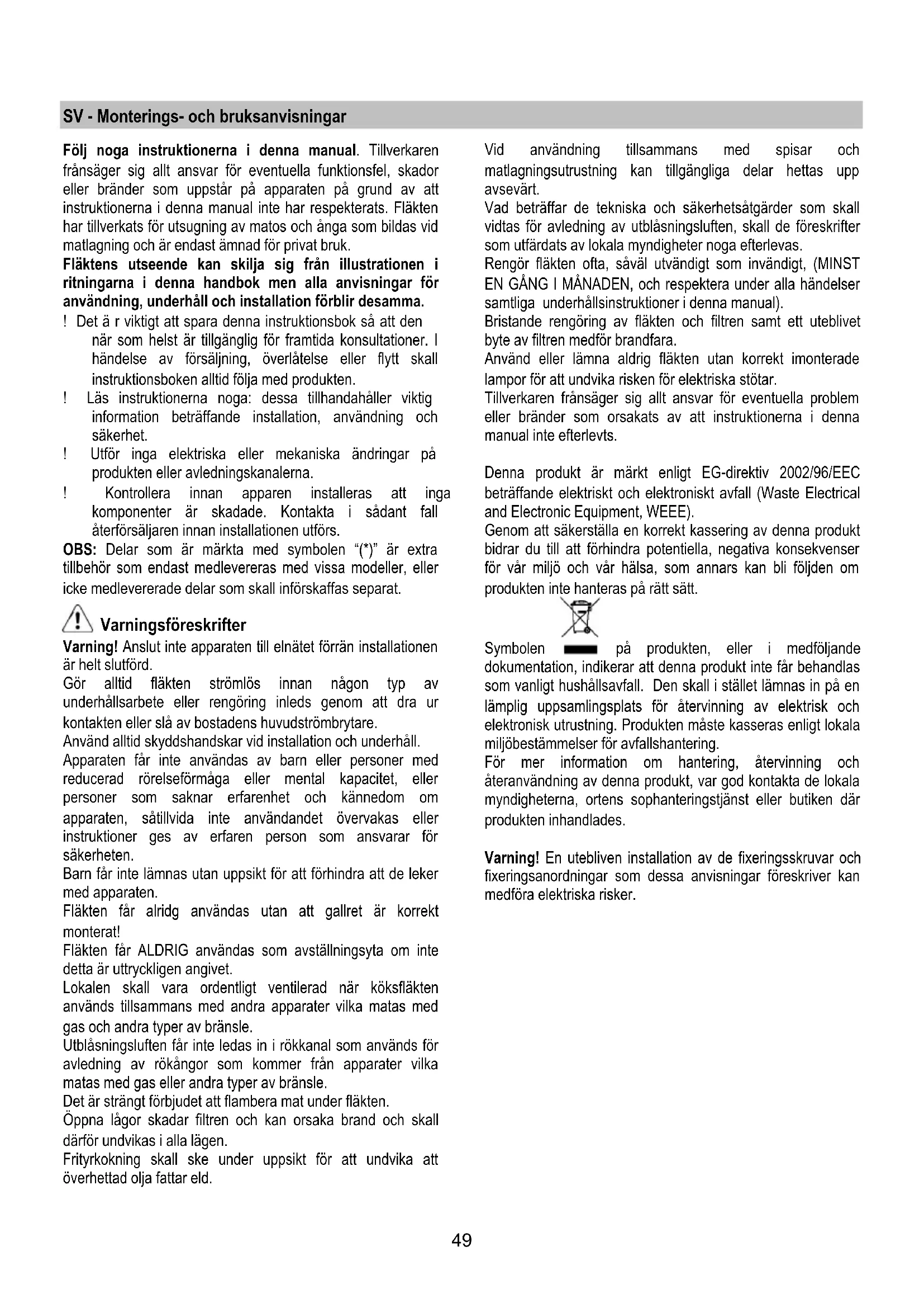 Για την αντικατάσταση τους, απευθυνθείτε στην υπηρεσία τεχνικής βοήθειας49 SV - Monterings- och bruksanvisningar Följ noga instruktionerna i denna manual. Tillverkaren frånsäger sig allt ansvar för eventuella funktionsfel, skador eller bränder som uppstår på apparaten på grund av att instruktionerna i denna manual inte har respekterats. Fläkten har tillverkats för utsugning av matos och ånga som bildas vid matlagning och är endast ämnad för privat bruk. Fläktens utseende kan skilja sig från illustrationen i ritningarna i denna handbok men alla anvisningar för användning, underhåll och installation förblir desamma. ! Det ä r viktigt att spara denna instruktionsbok så att den när som helst är tillgänglig för framtida konsultationer. I händelse av försäljning, överlåtelse eller flytt skall instruktionsboken alltid följa med produkten. ! Läs instruktionerna noga: dessa tillhandahåller viktig information beträffande installation, användning och säkerhet. ! Utför inga elektriska eller mekaniska ändringar på produkten eller avledningskanalerna. ! Kontrollera innan apparen installeras att inga komponenter är skadade. Kontakta i sådant fall återförsäljaren innan installationen utförs. OBS: Delar som är märkta med symbolen “(*)” är extra tillbehör som endast medlevereras med vissa modeller, eller icke medlevererade delar som skall införskaffas separat. Varningsföreskrifter Varning! Anslut inte apparaten till elnätet förrän installationen är helt slutförd. Gör alltid fläkten strömlös innan någon typ av underhållsarbete eller rengöring inleds genom att dra ur kontakten eller slå av bostadens huvudströmbrytare. Använd alltid skyddshandskar vid installation och underhåll. Apparaten får inte användas av barn eller personer med reducerad rörelseförmåga eller mental kapacitet, eller personer som saknar erfarenhet och kännedom om apparaten, såtillvida inte användandet övervakas eller instruktioner ges av erfaren person som ansvarar för säkerheten. Barn får inte lämnas utan uppsikt för att förhindra att de leker med apparaten. Fläkten får alridg användas utan att gallret är korrekt monterat! Fläkten får ALDRIG användas som avställningsyta om inte detta är uttryckligen angivet. Lokalen skall vara ordentligt ventilerad när köksfläkten används tillsammans med andra apparater vilka matas med gas och andra typer av bränsle. Utblåsningsluften får inte ledas in i rökkanal som används för avledning av rökångor som kommer från apparater vilka matas med gas eller andra typer av bränsle. Det är strängt förbjudet att flambera mat under fläkten. Öppna lågor skadar filtren och kan orsaka brand och skall därför undvikas i alla lägen. Frityrkokning skall ske under uppsikt för att undvika att överhettad olja fattar eld. Vid användning tillsammans med spisar och matlagningsutrustning kan tillgängliga delar hettas upp avsevärt. Vad beträffar de tekniska och säkerhetsåtgärder som skall vidtas för avledning av utblåsningsluften, skall de föreskrifter som utfärdats av lokala myndigheter noga efterlevas. Rengör fläkten ofta, såväl utvändigt som invändigt, (MINST EN GÅNG I MÅNADEN, och respektera under alla händelser samtliga underhållsinstruktioner i denna manual). Bristande rengöring av fläkten och filtren samt ett uteblivet byte av filtren medför brandfara. Använd eller lämna aldrig fläkten utan korrekt imonterade lampor för att undvika risken för elektriska stötar. Tillverkaren frånsäger sig allt ansvar för eventuella problem eller bränder som orsakats av att instruktionerna i denna manual inte efterlevts. Denna produkt är märkt enligt EG-direktiv 2002/96/EEC beträffande elektriskt och elektroniskt avfall (Waste Electrical and Electronic Equipment, WEEE). Genom att säkerställa en korrekt kassering av denna produkt bidrar du till att förhindra potentiella, negativa konsekvenser för vår miljö och vår hälsa, som annars kan bli följden om produkten inte hanteras på rätt sätt. Symbolen på produkten, eller i medföljande dokumentation, indikerar att denna produkt inte får behandlas som vanligt hushållsavfall. Den skall i stället lämnas in på en lämplig uppsamlingsplats för återvinning av elektrisk och elektronisk utrustning. Produkten måste kasseras enligt lokala miljöbestämmelser för avfallshantering. För mer information om hantering, återvinning och återanvändning av denna produkt, var god kontakta de lokala myndigheterna, ortens sophanteringstjänst eller butiken där produkten inhandlades. Varning! En utebliven installation av de fixeringsskruvar och fixeringsanordningar som dessa anvisningar föreskriver kan medföra elektriska risker.50 Användning Fläkten har tillverkats för att användas som utsugningsversion med utvändig evakuering eller som filterversion med intern återcirkulation. Utsugningsversion Matoset leds ut ur lokalen med hjälp av ett avledningsrör som är fixerat på anslutningsflänsen. Avledningsröret skall ha samma diameter som anslutningsflänsen. Varning! Avledningsröret medlevereras inte och skall införskaffas separat. Röret skall, även när det är horisontellt draget, alltid luta lätt (cirka 10°) uppåt, så att luften lätt kan ledas ut ur lokalen. I det fall fläkten är försedd med kolfilter skall dessa tas ur. Rören och utloppsöppningarna i väggen med vilka fläkten skall anslutas bör ha samma diameter som luftutsläppet (anslutningsflänsen). I det fall man använder rör och utloppsöppningar i väggen med mindre diameter medför detta en lägre utblåsprestanda och en drastisk förhöjning av bullernivån. Vi avsäger oss därför allt ansvar gällande denna typ av problem. ! Använd ett så kort rör som möjligt. ! Röret skall vara så rakt som möjligt (högsta tillåtna vinkel på böjarna 90°). ! Undvik stora skillnader i röret