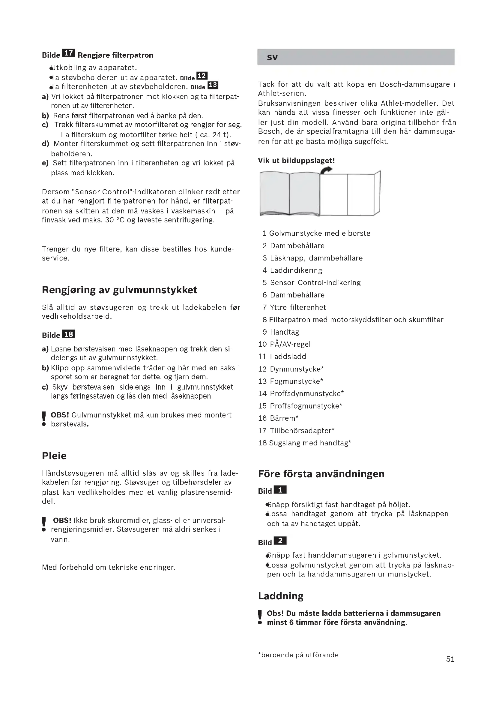 Tack för att du valt att köpa en Bosch-dammsugare i Athlet-serien. Bruksanvisningen beskriver olika Athlet-modeller. Det kan hända att vissa finesser och funktioner inte gäl- ler just din modell. Använd bara originaltillbehör från Bosch, de är specialframtagna till den här dammsuga- ren för att ge bästa möjliga sugeffekt. Vik ut bilduppslaget! 1 Golvmunstycke med elborste 2 Dammbehållare 3 Låsknapp, dammbehållare 4 Laddindikering 5 Sensor Control-indikering 6 Dammbehållare 7 Yttre filterenhet 8 Filterpatron med motorskyddsfilter och skumfilter 9 Handtag 10 PÅ/AV-regel 11 Laddsladd 12 Dynmunstycke* 13 Fogmunstycke* 14 Proffsdynmunstycke* 15 Proffsfogmunstycke* 16 Bärrem* 17 Tillbehörsadapter* 18 Sugslang med handtag* Före första användningen Bild