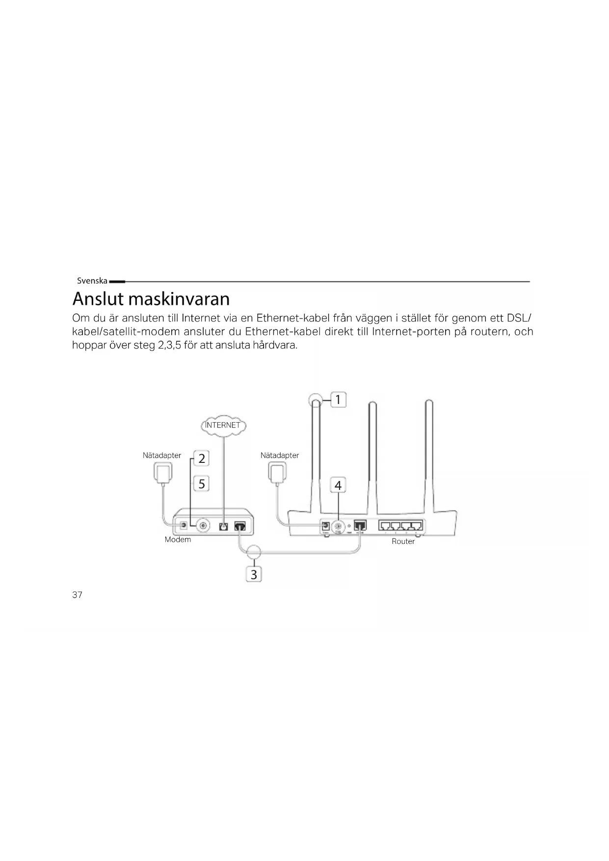 - /RJLQRSGHZHEFRQƮJXUDWLRQYDQGHURXWHURPXZZDFKWZRRUGLQWH]LHQRIRPXZGUDDGOR]HZDFKWZRRUGWH resetten. Opmerking: Voor meer informatie over uw router, ga naar de website https://www.tp-link.com om de gebruikershandleiding van uw router te downloaden.37 Svenska Anslut maskinvaran Om du är ansluten till Internet via en Ethernet-kabel från väggen i stället för genom ett DSL/ kabel/satellit-modem ansluter du Ethernet-kabel direkt till Internet-porten på routern, och hoppar över steg 2,3,5 för att ansluta hårdvara.