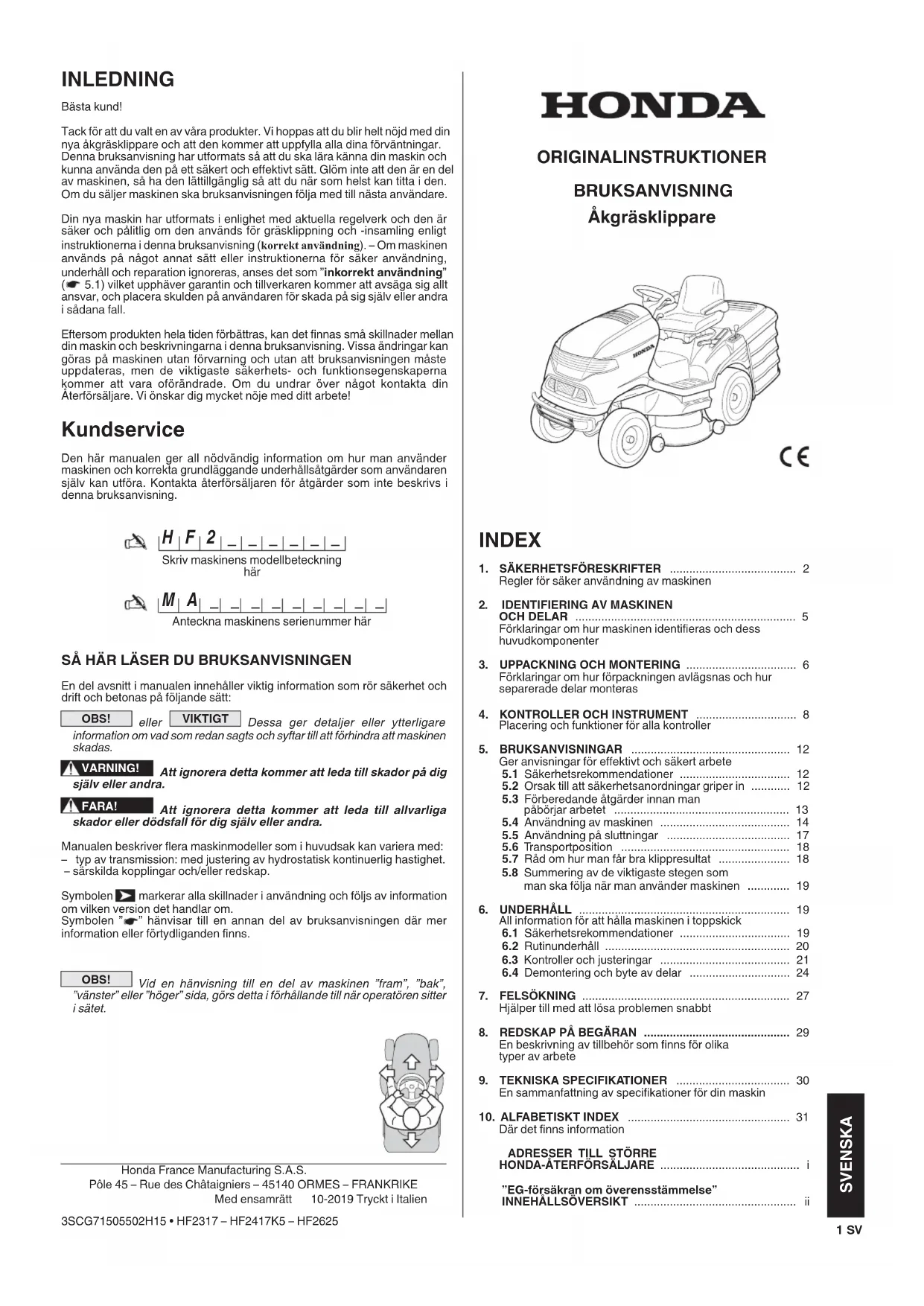 Där det nns information ADRESSER TILL STÖRRE HONDA-ÅTERFÖRSÄLJARE ........................................... i ”EG-försäkran om överensstämmelse” INNEHÅLLSÖVERSIKT .................................................. ii 1 SV ORIGINALINSTRUKTIONER BRUKSANVISNING Åkgräsklippare Honda France Manufacturing S.A.S.Pôle 45 – Rue des Châtaigniers – 45140 ORMES – FRANKRIKEMed ensamrättSkriv maskinens modellbeteckning här H F 2 _ _ _ _ _ _ Anteckna maskinens serienummer här M A _ _ _ _ _ _ _ _ _ 10-2019 Tryckt i Italien3SCG71505502H15 • HF2317 – HF2417K5 – HF2625 SVENSKA– Fyll på bränsle, med hjälp av en tratt och endast utomhus, rök inte under denna åtgärd eller när bränsle hanteras. – Fyll på med bränsle innan du startar motorn, ta aldrig bort tanklocket eller fyll på bränsle när motorn är igång eller när den är varm. – Om bränsle spillts ut, ska du inte försöka starta motorn, utan i stället ytta maskinen från området och undvika att föra in någon antändningskälla innan bränslet och ångorna har avdunstat. – Sätt alltid på locken på tank och behållare och skruva åt ordentligt. – Undvik att andas in bränsleångor. – Öppna bränsletanken långsam så att trycket inuti får minska gradvis. – Starta aldrig maskinen på samma plats som där du fyllde på bränsle. Motorn får inte startas på mindre än 3 meters avstånd från där du fyllde på bränsle. – Om du spillt bränsle på kläderna, måste du byta kläder innan du startar motorn.
