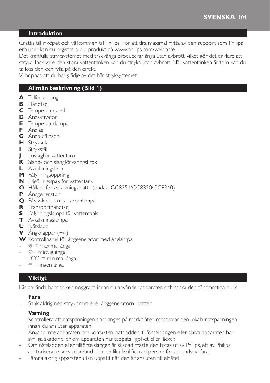 Téléchargez la notice de votre Strykjärn au format PDF gratuitement ! Retrouvez votre notice GC-8350 - PHILIPS et reprennez votre appareil électronique en main. Sur cette page sont publiés tous les documents nécessaires à l'utilisation de votre appareil GC-8350 de la marque PHILIPS.