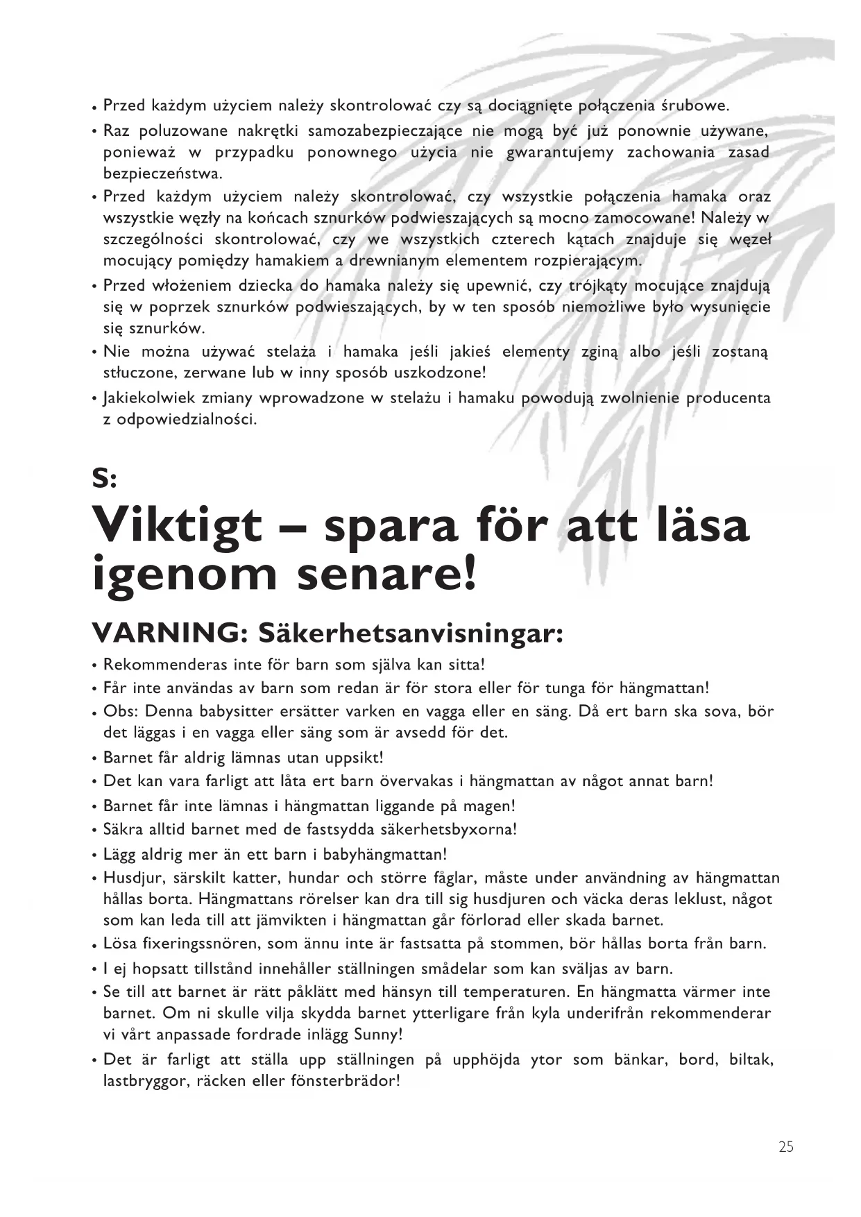 Varje förändring av ställning och hängmatta innebär att tillverkarens ansvar och garanti upphör att gälla. SK: Dôležité upozornenie – Tieto pokyny si odložte! VAROVNÉ UPOZORNENIE: Bezpečnostné Upozornenie: