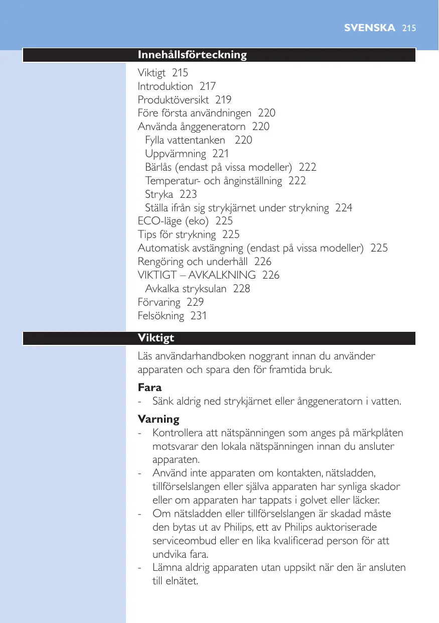 Temps de chauffe 126 Verrouillage du fer (certains modèles uniquement) 127 Température et réglage de la vapeur 128 Repassage 128 Mettre le fer sur son talon pendant le repassage 129 Mode ECO 130 Conseils pour le repassage 130 Mode Arrêt automatique (certains modèles uniquement) 131 Nettoyage et entretien 131 IMPORTANT - DÉTARTRAGE 131 Détartrer la semelle du fer 133 Rangement 135 Dépannage 136 -- N’utilisez pas l’appareil si la fiche, le cordon d’alimentation, le cordon d’arrivée de la vapeur ou l’appareil lui-même est endommagé, s’il est tombé ou s’il fuit. -- Si le cordon d’alimentation ou le cordon d’arrivée de la vapeur est endommagé, il doit être remplacé par Philips, par un Centre Service Agréé Philips ou par une personne qualifiée afin d’éviter tout accident. -- Ne laissez jamais l’appareil sans surveillance pendant qu’il est branché.