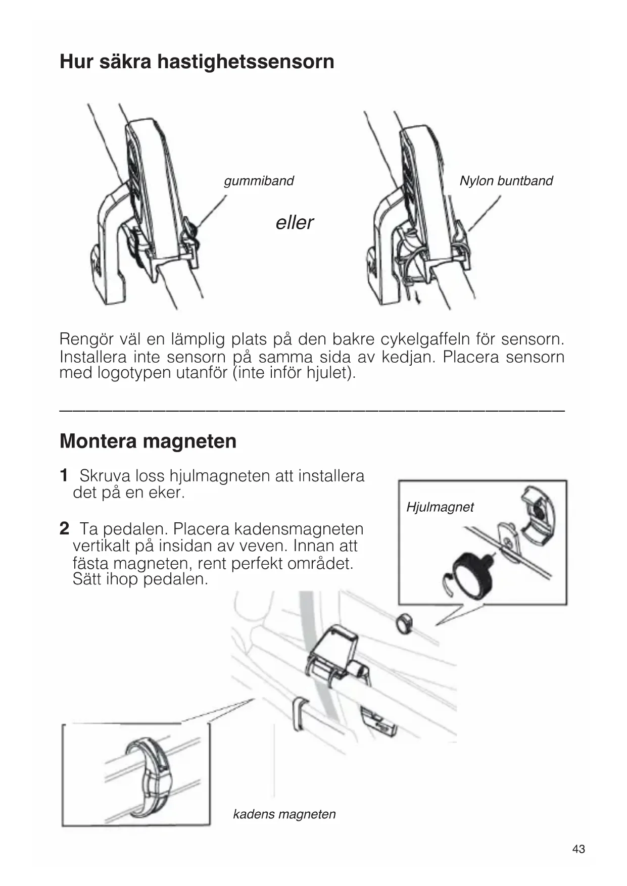 Hur att montera hastighetssensorn och magneten Hastighetssensor kadens magneten Hjulmagnet Skruvmejsel Nylon kabel Gummiband Taktgivare Hastighetssensor Hjulmagnet Kadens magneten43 Hur säkra hastighetssensorn Rengör väl en lämplig plats på den bakre cykelgaffeln för sensorn. Installera inte sensorn på samma sida av kedjan. Placera sensorn med logotypen utanför (inte inför hjulet).