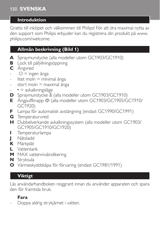 Téléchargez la notice de votre Strykjärn au format PDF gratuitement ! Retrouvez votre notice GC1910/02 - PHILIPS et reprennez votre appareil électronique en main. Sur cette page sont publiés tous les documents nécessaires à l'utilisation de votre appareil GC1910/02 de la marque PHILIPS.