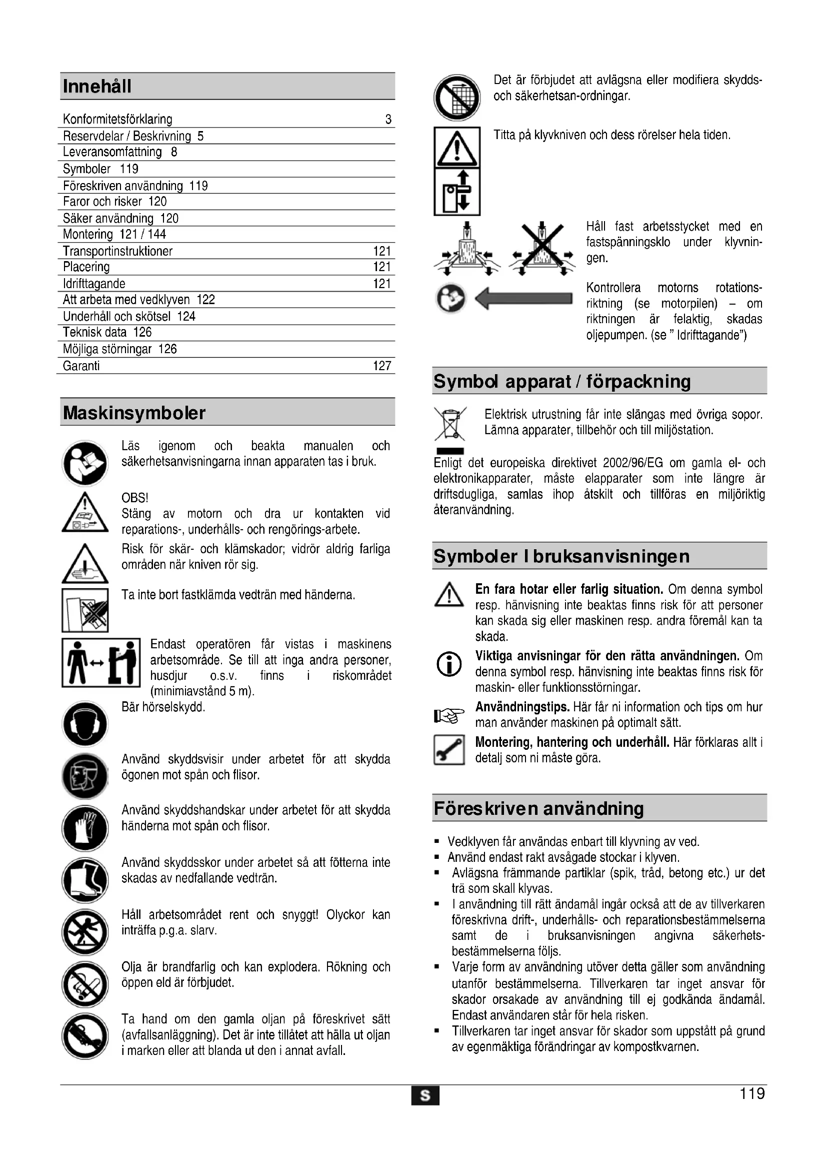 Konformitetsförklaring 3 Reservdelar / Beskrivning 5 Leveransomfattning 8 Symboler 119 Föreskriven användning 119 Faror och risker 120 Säker användning 120 Montering 121 / 144 Transportinstruktioner 121 Placering 121 Idrifttagande 121 Att arbeta med vedklyven 122 Underhåll och skötsel 124 Teknisk data 126 Möjliga störningar 126 Garanti 127