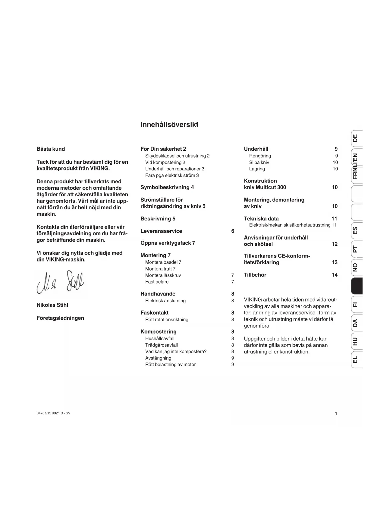 Bästa kund Tack för att du har bestämt dig för en kvalitetsprodukt från VIKING. Denna produkt har tillverkats med moderna metoder och omfattande åtgärder för att säkerställa kvaliteten har genomförts. Vårt mål är inte upp- nått förrän du är helt nöjd med din maskin. Kontakta din återförsäljare eller vår försäljningsavdelning om du har frå- gor beträffande din maskin. Vi önskar dig nytta och glädje med din VIKING-maskin. Nikolas Stihl Företagsledningen Innehållsöversikt VIKING arbetar hela tiden med vidareut- veckling av alla maskiner och appara- ter; ändring av leveransservice i form av teknik och utrustning måste vi därför få genomföra. Uppgifter och bilder i detta häfte kan därför inte gälla som bevis på annan utrustning eller konstruktion. För Din säkerhet 2 Skyddsklädsel och utrustning 2 Vid kompostering 2 Underhåll och reparationer 3 Fara pga elektrisk ström 3 Symbolbeskrivning 4 Strömställare för riktningsändring av kniv 5 Beskrivning 5 Leveransservice 6 Öppna verktygsfack 7 Montering 7 Montera basdel 7 Montera tratt 7 Montera låsskruv 7 Fäst pelare 7 Handhavande 8 Elektrisk anslutning 8 Faskontakt 8 Rätt rotationsriktning 8 Kompostering 8 Hushållsavfall 8 Trädgårdsavfall 8 Vad kan jag inte kompostera? 8 Avstängning 9 Rätt belastning av motor 9 Underhåll 9 Rengöring 9 Slipa kniv 10 Lagring 10 Konstruktion kniv Multicut 300 10 Montering, demontering av kniv 10 Tekniska data 11 Elektrisk/mekanisk säkerhetsutrustning 11 Anvisningar för underhåll och skötsel 12 Tillverkarens CE-konform- itetsförklaring 13 Tillbehör 142 0478 215 9921 B - SV Vid arbete med kompostk- varnen skall alltid säker- hets- och olycksfallsföres- krifterna följas. Läs hela bruksanvisningen noggrant innan du använ- der trimmern första gån- gen och förvara den på ett säkert ställe för senare referens. Bekanta dig med reglagen och maskinens användning. VIKING-kompostkvar- nar är till för privat användning och är lämpliga för kompostering av organiskt avfall från hushåll och trädgård. Kompostkvarnen får inte användas för material eller för arbeten, som inte står i denna bruksanvisning. Man får bara använda utrustning, som har levererats av VIKING eller som har god- känts för denna apparat. Inga ändringar får genomföras, eftersom detta kan medföra ökad olycksrisk.
