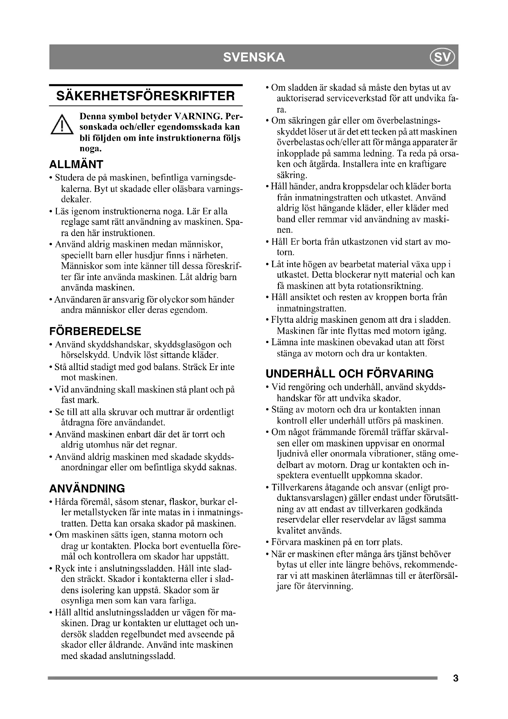 ALLMÄNT Denna symbol betyder VARNING. All- varlig personskada och/eller egendoms- skada kan bli följden om inte instruktionerna följs noga. Före start skall denna bruksanvisning samt dess SÄKERHETSFÖRESKRIF- TER läsas noga. SYMBOLER Följande symboler finns på maskinen för att på- minna om den försiktighet och uppmärksamhet som krävs vid användning och underhåll. Symbolerna betyder: Varning! Läs noga samtliga instruktioner innan ma- skinen används. Varning! Håll åskådare borta. Se upp med utkastade föremål. Varning! För ej in hand eller fot underkåpan då ma- skinen är igång. Varning! - roterande knivar. Knivarna fortsätter att rotera efter det att maskinen stängts av. Varning! Drag ur stickkontakten innan någon typ av underhåll utförs. Varning! Använd maskinen enbart där det är torrt och aldrig utomhus när det regnar. Varning! Använd skyddshandskar, skyddsglasögon och hörselskydd. MONTERING