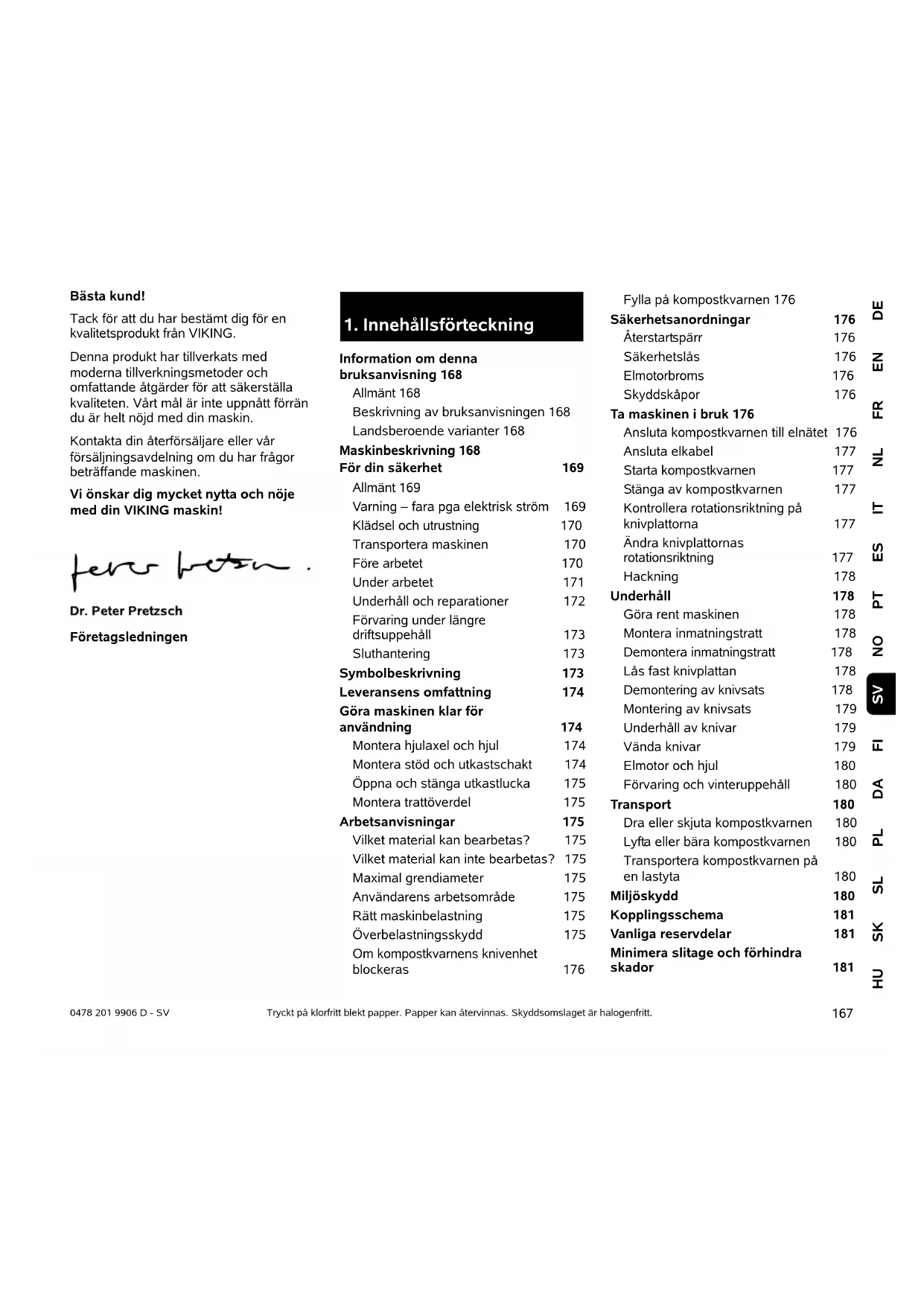 Information om denna bruksanvisning 168 Allmänt 168 Beskrivning av bruksanvisningen 168 Landsberoende varianter 168 Maskinbeskrivning 168 För din säkerhet 169 Allmänt 169 Varning – fara pga elektrisk ström 169 Klädsel och utrustning 170 Transportera maskinen 170 Före arbetet 170 Under arbetet 171 Underhåll och reparationer 172 Förvaring under längre driftsuppehåll 173 Sluthantering 173 Symbolbeskrivning 173 Leveransens omfattning 174 Göra maskinen klar för användning 174 Montera hjulaxel och hjul 174 Montera stöd och utkastschakt 174 Öppna och stänga utkastlucka 175 Montera trattöverdel 175 Arbetsanvisningar 175 Vilket material kan bearbetas? 175 Vilket material kan inte bearbetas? 175 Maximal grendiameter 175 Användarens arbetsområde 175 Rätt maskinbelastning 175 Överbelastningsskydd 175 Om kompostkvarnens knivenhet blockeras 176 Fylla på kompostkvarnen 176 Säkerhetsanordningar 176 Återstartspärr 176 Säkerhetslås 176 Elmotorbroms 176 Skyddskåpor 176 Ta maskinen i bruk 176 Ansluta kompostkvarnen till elnätet 176 Ansluta elkabel 177 Starta kompostkvarnen 177 Stänga av kompostkvarnen 177 Kontrollera rotationsriktning på knivplattorna 177 Ändra knivplattornas rotationsriktning 177 Hackning 178 Underhåll 178 Göra rent maskinen 178 Montera inmatningstratt 178 Demontera inmatningstratt 178 Lås fast knivplattan 178 Demontering av knivsats 178 Montering av knivsats 179 Underhåll av knivar 179 Vända knivar 179 Elmotor och hjul 180 Förvaring och vinteruppehåll 180 Transport 180 Dra eller skjuta kompostkvarnen 180 Lyfta eller bära kompostkvarnen 180 Transportera kompostkvarnen på en lastyta 180 Miljöskydd 180 Kopplingsschema 181 Vanliga reservdelar 181 Minimera slitage och förhindra skador 1810478 201 9906 D - SV
