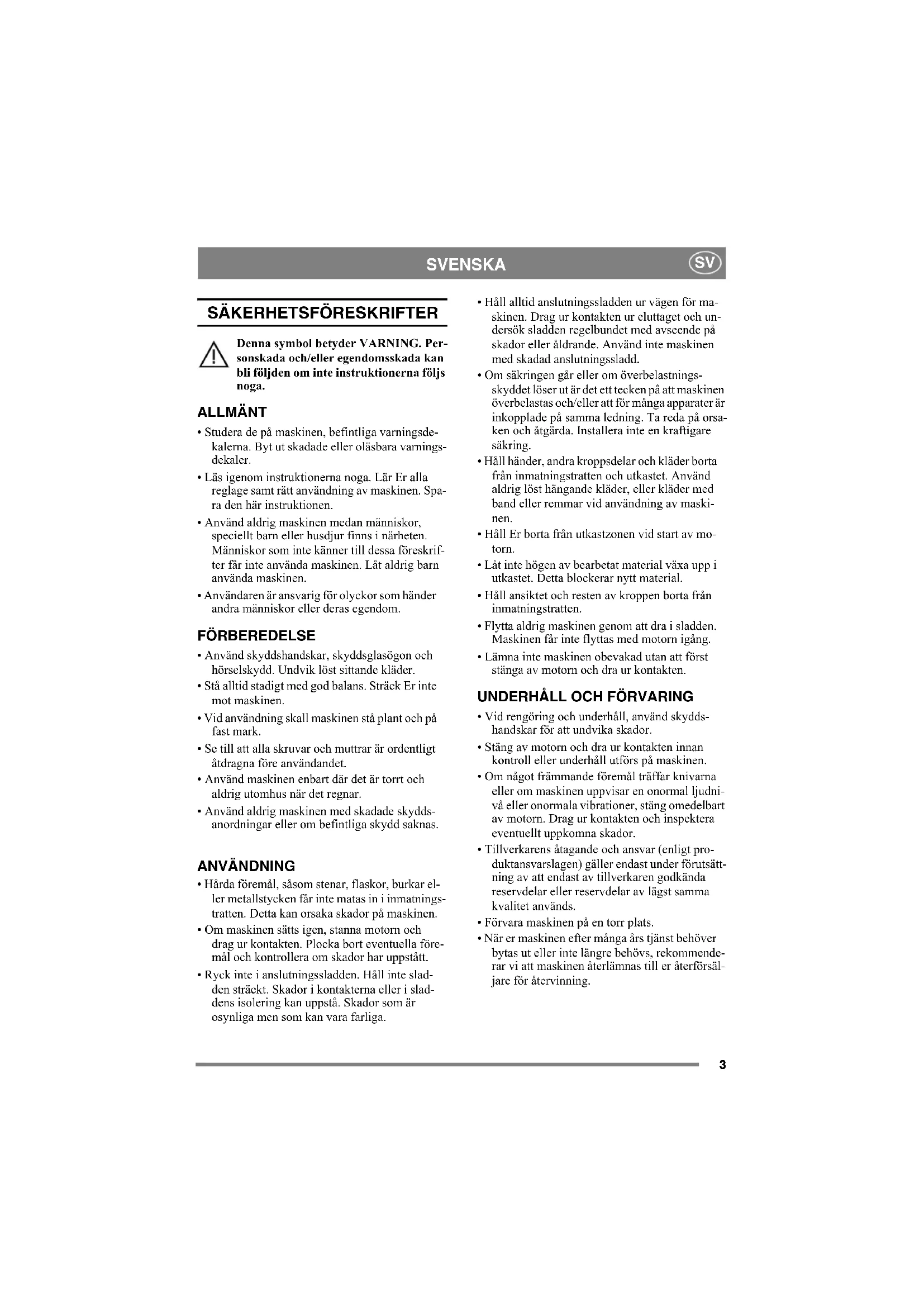 - Håll händer, andra kroppsdelar och kläder borta från inmatningstratten och utkastet. Använd aldrig löst hängande kläder, eller kläder med band eller remmar vid användning av maski- nen.