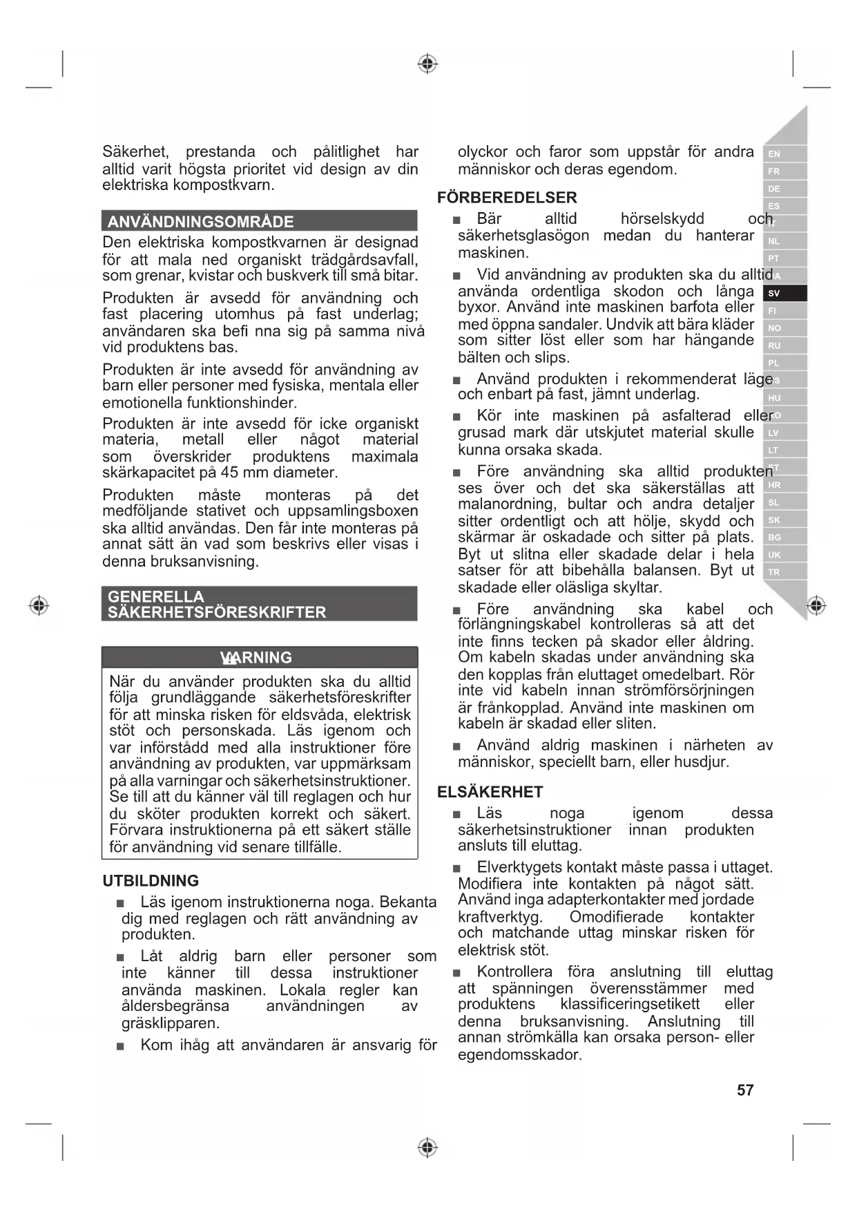 Den elektriska kompostkvarnen är designad för att mala ned organiskt trädgårdsavfall, som grenar, kvistar och buskverk till små bitar. Produkten är avsedd för användning och fast placering utomhus på fast underlag; användaren ska befi nna sig på samma nivå vid produktens bas. Produkten är inte avsedd för användning av barn eller personer med fysiska, mentala eller emotionella funktionshinder. Produkten är inte avsedd för icke organiskt materia, metall eller något material som överskrider produktens maximala skärkapacitet på 45 mm diameter. Produkten måste monteras på det medföljande stativet och uppsamlingsboxen ska alltid användas. Den får inte monteras på annat sätt än vad som beskrivs eller visas i denna bruksanvisning. GENERELLA