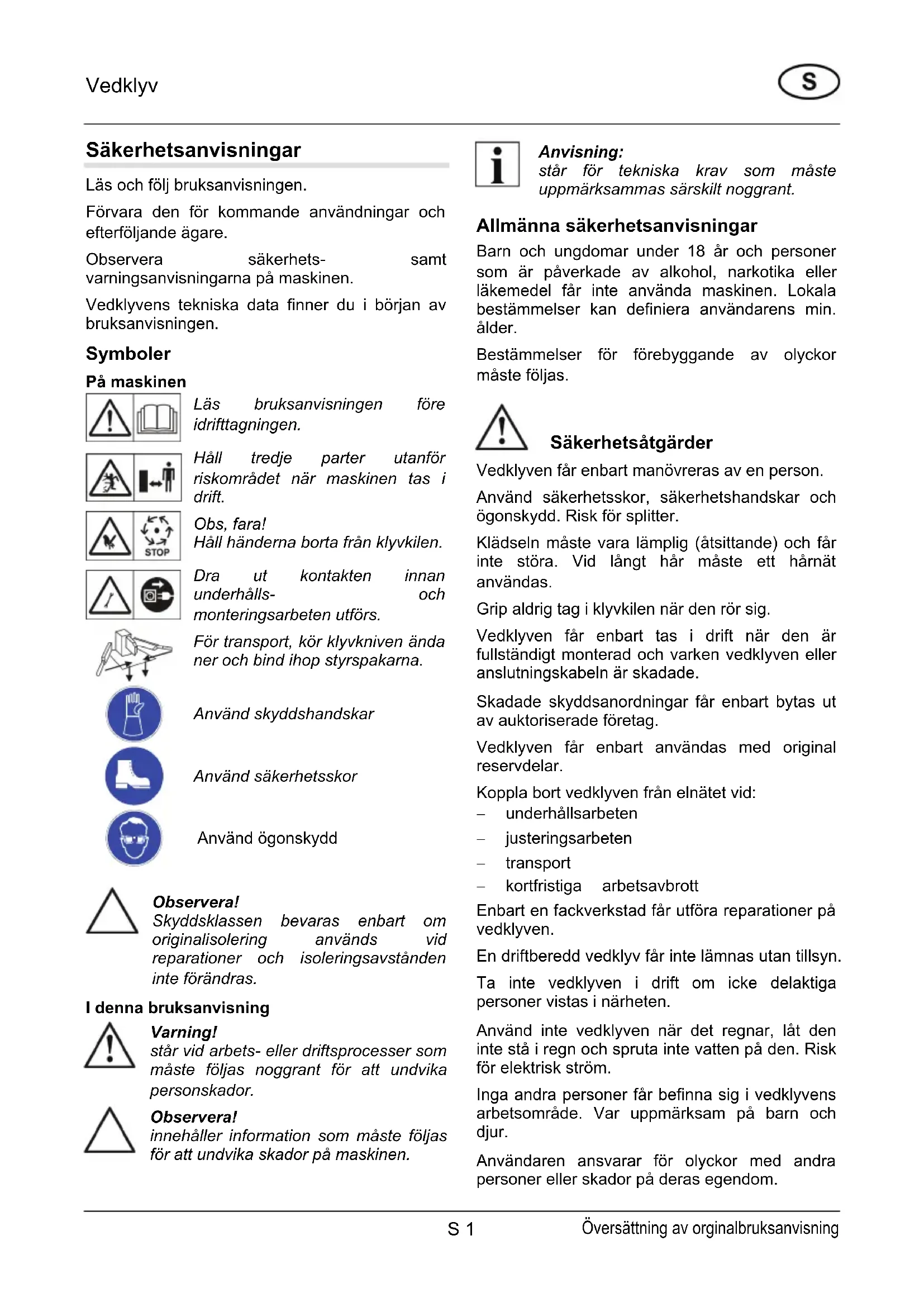 Anvisning: står för tekniska krav som måste uppmärksammas särskilt noggrant. Allmänna säkerhetsanvisningar Barn och ungdomar under 18 år och personer som är påverkade av alkohol, narkotika eller läkemedel får inte använda maskinen. Lokala bestämmelser kan definiera användarens min. ålder. Bestämmelser för förebyggande av olyckor måste följas. Säkerhetsåtgärder Vedklyven får enbart manövreras av en person. Använd säkerhetsskor, säkerhetshandskar och ögonskydd. Risk för splitter. Klädseln måste vara lämplig (åtsittande) och får inte störa. Vid långt hår måste ett hårnät användas. Grip aldrig tag i klyvkilen när den rör sig. Vedklyven får enbart tas i drift när den är fullständigt monterad och varken vedklyven eller anslutningskabeln är skadade. Skadade skyddsanordningar får enbart bytas ut av auktoriserade företag. Vedklyven får enbart användas med original reservdelar. Koppla bort vedklyven från elnätet vid: − underhållsarbeten − justeringsarbeten − transport − kortfristiga arbetsavbrott Enbart en fackverkstad får utföra reparationer på vedklyven. En driftberedd vedklyv får inte lämnas utan tillsyn. Ta inte vedklyven i drift om icke delaktiga personer vistas i närheten. Använd inte vedklyven när det regnar, låt den inte stå i regn och spruta inte vatten på den. Risk för elektrisk ström. Inga andra personer får befinna sig i vedklyvens arbetsområde. Var uppmärksam på barn och djur. Användaren ansvarar för olyckor med andra personer eller skador på deras egendom. Översättning av orginalbruksanvisningVedklyv S 2 Arbetsområdet måste hållas fritt från träbitar – risk för att snubbla. Säkerhetsanordningar Motorskyddsbrytare När vedklyven överbelastas stänger motorskyddsbrytaren automatiskt av motorn. Motorskyddsbrytarens funktion måste garanteras. Har motorskyddsbrytaren stängt av vedklyven, gör så här: