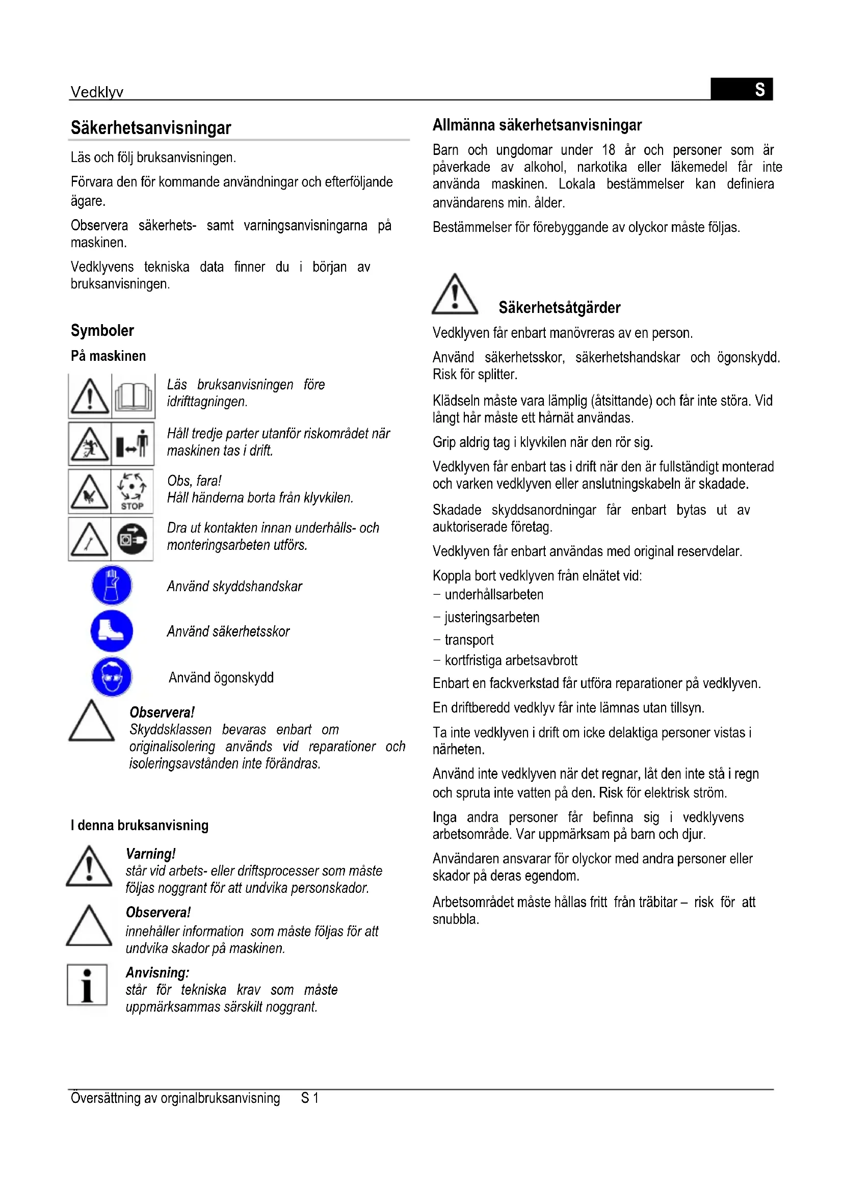 Säkerhetsanvisningar Läs och följ bruksanvisningen. Förvara den för kommande användningar och efterföljande ägare. Observera säkerhets- samt varningsanvisningarna på maskinen. Vedklyvens tekniska data finner du i början av bruksanvisningen. Symboler På maskinen Läs bruksanvisningen före idrifttagningen. Håll tredje parter utanför riskområdet när maskinen tas i drift. Obs, fara! Håll händerna borta från klyvkilen. Dra ut kontakten innan underhålls- och monteringsarbeten utförs. Använd skyddshandskar Använd säkerhetsskor Använd ögonskydd Observera! Skyddsklassen bevaras enbart om originalisolering används vid reparationer och isoleringsavstånden inte förändras. I denna bruksanvisning Varning! står vid arbets- eller driftsprocesser som måste följas noggrant för att undvika personskador. Observera! innehåller information som måste följas för att undvika skador på maskinen. Anvisning: står för tekniska krav som måste uppmärksammas särskilt noggrant. Allmänna säkerhetsanvisningar Barn och ungdomar under 18 år och personer som är påverkade av alkohol, narkotika eller läkemedel får inte använda maskinen. Lokala bestämmelser kan definiera användarens min. ålder. Bestämmelser för förebyggande av olyckor måste följas. Säkerhetsåtgärder Vedklyven får enbart manövreras av en person. Använd säkerhetsskor, säkerhetshandskar och ögonskydd. Risk för splitter. Klädseln måste vara lämplig (åtsittande) och får inte störa. Vid långt hår måste ett hårnät användas. Grip aldrig tag i klyvkilen när den rör sig. Vedklyven får enbart tas i drift när den är fullständigt monterad och varken vedklyven eller anslutningskabeln är skadade. Skadade skyddsanordningar får enbart bytas ut av auktoriserade företag. Vedklyven får enbart användas med original reservdelar. Koppla bort vedklyven från elnätet vid: − underhållsarbeten − justeringsarbeten − transport − kortfristiga arbetsavbrott Enbart en fackverkstad får utföra reparationer på vedklyven. En driftberedd vedklyv får inte lämnas utan tillsyn. Ta inte vedklyven i drift om icke delaktiga personer vistas i närheten. Använd inte vedklyven när det regnar, låt den inte stå i regn och spruta inte vatten på den. Risk för elektrisk ström. Inga andra personer får befinna sig i vedklyvens arbetsområde. Var uppmärksam på barn och djur. Användaren ansvarar för olyckor med andra personer eller skador på deras egendom. Arbetsområdet måste hållas fritt från träbitar – risk för att snubbla. Översättning av orginalbruksanvisning S 1S Vedklyv Säkerhetsanordningar Motorskyddsbrytare När vedklyven överbelastas stänger motorskyddsbrytaren automatiskt av motorn. Motorskyddsbrytarens funktion måste garanteras. Har motorskyddsbrytaren stängt av vedklyven, gör så här: