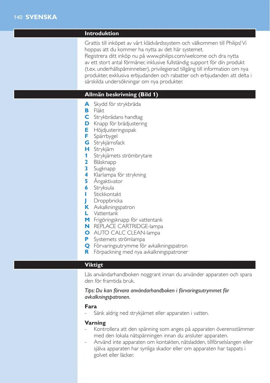 Viktigt Läs användarhandboken noggrant innan du använder apparaten och spara den för framtida bruk. Tips: Du kan förvara användarhandboken i förvaringsutrymmet för avkalkningspatronen. Fara -- Sänk aldrig ned strykjärnet eller apparaten i vatten. Varning -- Kontrollera att den spänning som anges på apparaten överensstämmer med den lokala nätspänningen innan du ansluter apparaten. -- Använd inte apparaten om kontakten, nätsladden, tillförselslangen eller själva apparaten har synliga skador eller om apparaten har tappats i golvet eller läcker.