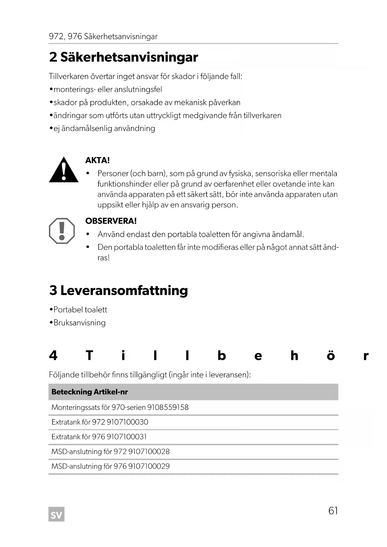 - Bruksanvisning 4Tillbehör Följande tillbehör finns tillgängligt (ingår inte i leveransen): Beteckning Artikel-nrMonteringssats för 970-serien 9108559158Extratank för 972 9107100030Extratank för 976 9107100031MSD-anslutning för 972 9107100028MSD-anslutning för 976 9107100029 970-Toilets-O-18s.book Seite 61 Montag, 27. Februar 2017 6:20 18SV Ändamålsenlig användning 972, 976