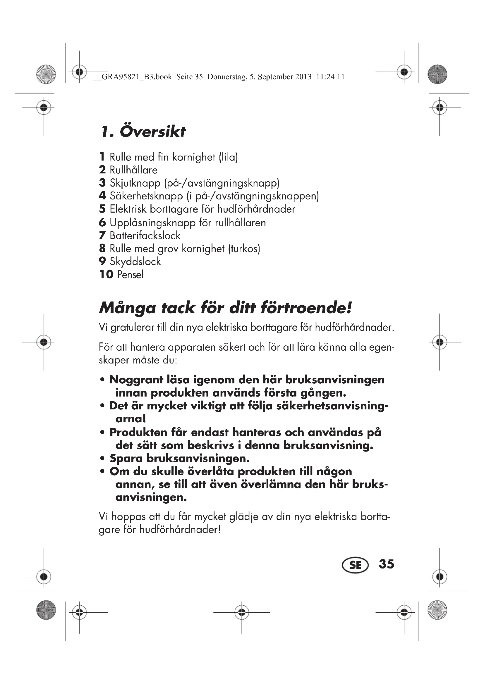 - Om du skulle överlåta produkten till någon annan, se till att även överlämna den här bruks- anvisningen. Vi hoppas att du får mycket glädje av din nya elektriska bortta- gare för hudförhårdnader! __GRA95821_B3.book Seite 35 Donnerstag, 5. September 2013 11:24 1136
