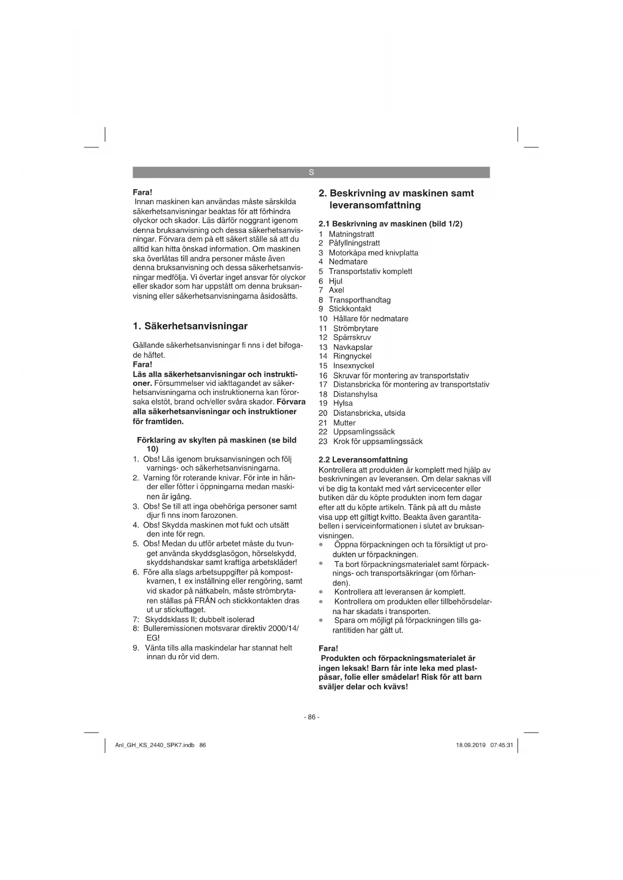 Innan maskinen kan anvandas maste sarskilda sakerhetsanvisningar beaktas for att forhindra olyckor och skador. Las darrfor noggrant igenomenna dnuksanvising och dessa sakerhetsanvis- ngar.Forvara dem paett sakert stalle saatt du alltid kan hitta onskad information.Om maskinen sha overlatas till andra personer maste avenenna brauksanvising och dessa sakerhetsanvis- ngar medfolja.Vi overtar inget ansvar for olyckor erler skador som har uppstatt omenna bruksanvising ell sakerhetsanvisingarna asidosatts.