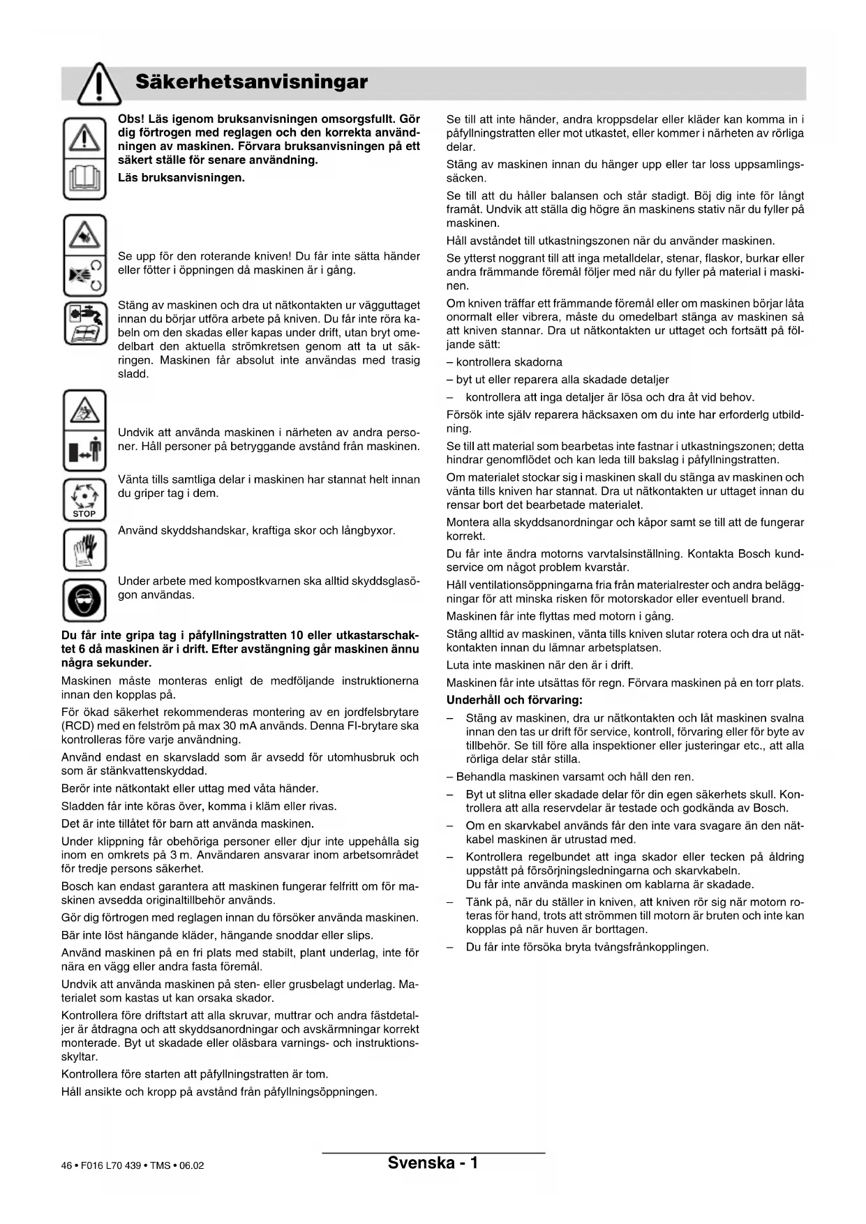 Overensstemmelseserklæring F016 L70 439 - book.book Seite 5 Dienstag, 28. Februar 2006 7:57 07 45 • F016 L70 439 • TMS • 06.02Svenska - 1 Obs! Läs igenom bruksanvisningen omsorgsfullt. Gör dig förtrogen med reglagen och den korrekta använd- ningen av maskinen. Förvara bruksanvisningen på ett säkert ställe för senare användning. Läs bruksanvisningen. Se upp för den roterande kniven! Du får inte sätta händer eller fötter i öppningen då maskinen är i gång. Stäng av maskinen och dra ut nätkontakten ur vägguttaget innan du börjar utföra arbete på kniven. Du får inte röra ka- beln om den skadas eller kapas under drift, utan bryt ome- delbart den aktuella strömkretsen genom att ta ut säk- ringen. Maskinen får absolut inte användas med trasig sladd. Undvik att använda maskinen i närheten av andra perso- ner. Håll personer på betryggande avstånd från maskinen. Vänta tills samtliga delar i maskinen har stannat helt innan du griper tag i dem. Använd skyddshandskar, kraftiga skor och långbyxor. Under arbete med kompostkvarnen ska alltid skyddsglasö- gon användas. Du får inte gripa tag i påfyllningstratten 10 eller utkastarschak- tet 6 då maskinen är i drift. Efter avstängning går maskinen ännu några sekunder. Maskinen måste monteras enligt de medföljande instruktionerna innan den kopplas på. För ökad säkerhet rekommenderas montering av en jordfelsbrytare (RCD) med en felström på max 30 mA används. Denna FI-brytare ska kontrolleras före varje användning. Använd endast en skarvsladd som är avsedd för utomhusbruk och som är stänkvattenskyddad. Berör inte nätkontakt eller uttag med våta händer. Sladden får inte köras över, komma i kläm eller rivas. Det är inte tillåtet för barn att använda maskinen. Under klippning får obehöriga personer eller djur inte uppehålla sig inom en omkrets på 3 m. Användaren ansvarar inom arbetsområdet för tredje persons säkerhet. Bosch kan endast garantera att maskinen fungerar felfritt om för ma- skinen avsedda originaltillbehör används. Gör dig förtrogen med reglagen innan du försöker använda maskinen. Bär inte löst hängande kläder, hängande snoddar eller slips. Använd maskinen på en fri plats med stabilt, plant underlag, inte för nära en vägg eller andra fasta föremål. Undvik att använda maskinen på sten- eller grusbelagt underlag. Ma- terialet som kastas ut kan orsaka skador. Kontrollera före driftstart att alla skruvar, muttrar och andra fästdetal- jer är åtdragna och att skyddsanordningar och avskärmningar korrekt monterade. Byt ut skadade eller oläsbara varnings- och instruktions- skyltar. Kontrollera före starten att påfyllningstratten är tom. Håll ansikte och kropp på avstånd från påfyllningsöppningen. Se till att inte händer, andra kroppsdelar eller kläder kan komma in i påfyllningstratten eller mot utkastet, eller kommer i närheten av rörliga delar. Stäng av maskinen innan du hänger upp eller tar loss uppsamlings- säcken. Se till att du håller balansen och står stadigt. Böj dig inte för långt framåt. Undvik att ställa dig högre än maskinens stativ när du fyller på maskinen. Håll avståndet till utkastningszonen när du använder maskinen. Se ytterst noggrant till att inga metalldelar, stenar, flaskor, burkar eller andra främmande föremål följer med när du fyller på material i maski- nen. Om kniven träffar ett främmande föremål eller om maskinen börjar låta onormalt eller vibrera, måste du omedelbart stänga av maskinen så att kniven stannar. Dra ut nätkontakten ur uttaget och fortsätt på föl- jande sätt: – kontrollera skadorna – byt ut eller reparera alla skadade detaljer – kontrollera att inga detaljer är lösa och dra åt vid behov. Försök inte själv reparera häcksaxen om du inte har erforderlg utbild- ning. Se till att material som bearbetas inte fastnar i utkastningszonen; detta hindrar genomflödet och kan leda till bakslag i påfyllningstratten. Om materialet stockar sig i maskinen skall du stänga av maskinen och vänta tills kniven har stannat. Dra ut nätkontakten ur uttaget innan du rensar bort det bearbetade materialet. Montera alla skyddsanordningar och kåpor samt se till att de fungerar korrekt. Du får inte ändra motorns varvtalsinställning. Kontakta Bosch kund- service om något problem kvarstår. Håll ventilationsöppningarna fria från materialrester och andra belägg- ningar för att minska risken för motorskador eller eventuell brand. Maskinen får inte flyttas med motorn i gång. Stäng alltid av maskinen, vänta tills kniven slutar rotera och dra ut nät- kontakten innan du lämnar arbetsplatsen. Luta inte maskinen när den är i drift. Maskinen får inte utsättas för regn. Förvara maskinen på en torr plats. Underhåll och förvaring: – Stäng av maskinen, dra ur nätkontakten och låt maskinen svalna innan den tas ur drift för service, kontroll, förvaring eller för byte av tillbehör. Se till före alla inspektioner eller justeringar etc., att alla rörliga delar står stilla. – Behandla maskinen varsamt och håll den ren. – Byt ut slitna eller skadade delar för din egen säkerhets skull. Kon- trollera att alla reservdelar är testade och godkända av Bosch. – Om en skarvkabel används får den inte vara svagare än den nät- kabel maskinen är utrustad med. – Kontrollera regelbundet att inga skador eller tecken på åldring uppstått på försörjningsledningarna och skarvkabeln. Du får inte använda maskinen om kablarna är skadade. – Tänk på, när du ställer in kniven, att kniven rör sig när motorn ro- teras för hand, trots att strömmen till motorn är bruten och inte kan kopplas på när huven är borttagen. – Du får inte försöka bryta tvångsfrånkopplingen. Säkerhetsanvisningar STOP F016 L70 439 - book.book Seite 1 Dienstag, 28. Februar 2006 7:57 07 46 • F016 L70 439 • TMS • 06.02Svenska - 2
