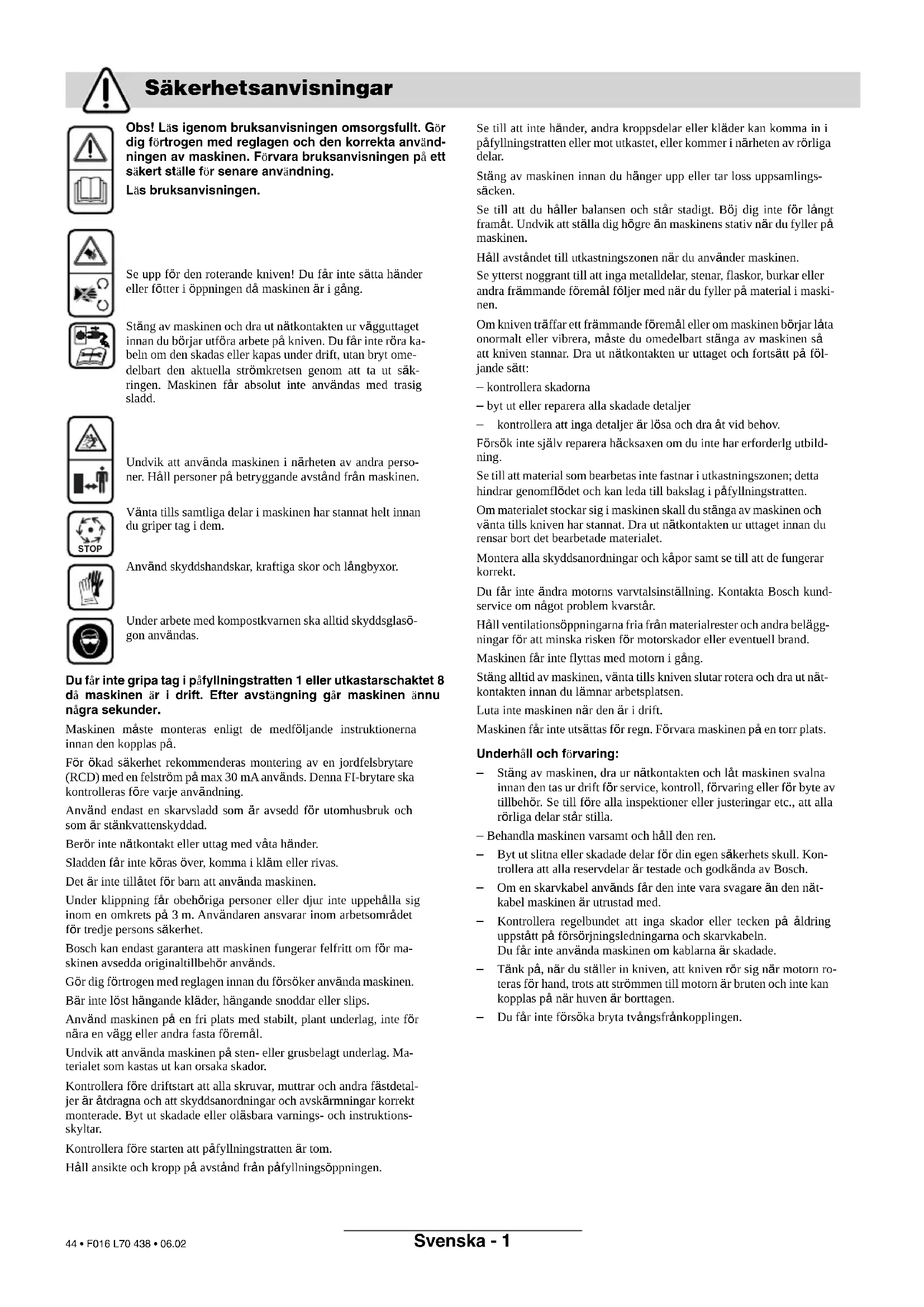 Ret til ændringer forbeholdes Service Overensstemmelseserklæring F016 L70 438 - book.book Seite 5 Dienstag, 28. Februar 2006 3:26 15 43 • F016 L70 438 • 06.02Svenska - 1 Obs! Läs igenom bruksanvisningen omsorgsfullt. Gör dig förtrogen med reglagen och den korrekta använd- ningen av maskinen. Förvara bruksanvisningen på ett säkert ställe för senare användning. Läs bruksanvisningen. Se upp för den roterande kniven! Du får inte sätta händer eller fötter i öppningen då maskinen är i gång. Stäng av maskinen och dra ut nätkontakten ur vägguttaget innan du börjar utföra arbete på kniven. Du får inte röra ka- beln om den skadas eller kapas under drift, utan bryt ome- delbart den aktuella strömkretsen genom att ta ut säk- ringen. Maskinen får absolut inte användas med trasig sladd. Undvik att använda maskinen i närheten av andra perso- ner. Håll personer på betryggande avstånd från maskinen. Vänta tills samtliga delar i maskinen har stannat helt innan du griper tag i dem. Använd skyddshandskar, kraftiga skor och långbyxor. Under arbete med kompostkvarnen ska alltid skyddsglasö- gon användas. Du får inte gripa tag i påfyllningstratten 1 eller utkastarschaktet 8 då maskinen är i drift. Efter avstängning går maskinen ännu några sekunder. Maskinen måste monteras enligt de medföljande instruktionerna innan den kopplas på. För ökad säkerhet rekommenderas montering av en jordfelsbrytare (RCD) med en felström på max 30 mA används. Denna FI-brytare ska kontrolleras före varje användning. Använd endast en skarvsladd som är avsedd för utomhusbruk och som är stänkvattenskyddad. Berör inte nätkontakt eller uttag med våta händer. Sladden får inte köras över, komma i kläm eller rivas. Det är inte tillåtet för barn att använda maskinen. Under klippning får obehöriga personer eller djur inte uppehålla sig inom en omkrets på 3 m. Användaren ansvarar inom arbetsområdet för tredje persons säkerhet. Bosch kan endast garantera att maskinen fungerar felfritt om för ma- skinen avsedda originaltillbehör används. Gör dig förtrogen med reglagen innan du försöker använda maskinen. Bär inte löst hängande kläder, hängande snoddar eller slips. Använd maskinen på en fri plats med stabilt, plant underlag, inte för nära en vägg eller andra fasta föremål. Undvik att använda maskinen på sten- eller grusbelagt underlag. Ma- terialet som kastas ut kan orsaka skador. Kontrollera före driftstart att alla skruvar, muttrar och andra fästdetal- jer är åtdragna och att skyddsanordningar och avskärmningar korrekt monterade. Byt ut skadade eller oläsbara varnings- och instruktions- skyltar. Kontrollera före starten att påfyllningstratten är tom. Håll ansikte och kropp på avstånd från påfyllningsöppningen. Se till att inte händer, andra kroppsdelar eller kläder kan komma in i påfyllningstratten eller mot utkastet, eller kommer i närheten av rörliga delar. Stäng av maskinen innan du hänger upp eller tar loss uppsamlings- säcken. Se till att du håller balansen och står stadigt. Böj dig inte för långt framåt. Undvik att ställa dig högre än maskinens stativ när du fyller på maskinen. Håll avståndet till utkastningszonen när du använder maskinen. Se ytterst noggrant till att inga metalldelar, stenar, flaskor, burkar eller andra främmande föremål följer med när du fyller på material i maski- nen. Om kniven träffar ett främmande föremål eller om maskinen börjar låta onormalt eller vibrera, måste du omedelbart stänga av maskinen så att kniven stannar. Dra ut nätkontakten ur uttaget och fortsätt på föl- jande sätt: – kontrollera skadorna – byt ut eller reparera alla skadade detaljer – kontrollera att inga detaljer är lösa och dra åt vid behov. Försök inte själv reparera häcksaxen om du inte har erforderlg utbild- ning. Se till att material som bearbetas inte fastnar i utkastningszonen; detta hindrar genomflödet och kan leda till bakslag i påfyllningstratten. Om materialet stockar sig i maskinen skall du stänga av maskinen och vänta tills kniven har stannat. Dra ut nätkontakten ur uttaget innan du rensar bort det bearbetade materialet. Montera alla skyddsanordningar och kåpor samt se till att de fungerar korrekt. Du får inte ändra motorns varvtalsinställning. Kontakta Bosch kund- service om något problem kvarstår. Håll ventilationsöppningarna fria från materialrester och andra belägg- ningar för att minska risken för motorskador eller eventuell brand. Maskinen får inte flyttas med motorn i gång. Stäng alltid av maskinen, vänta tills kniven slutar rotera och dra ut nät- kontakten innan du lämnar arbetsplatsen. Luta inte maskinen när den är i drift. Maskinen får inte utsättas för regn. Förvara maskinen på en torr plats. Underhåll och förvaring: – Stäng av maskinen, dra ur nätkontakten och låt maskinen svalna innan den tas ur drift för service, kontroll, förvaring eller för byte av tillbehör. Se till före alla inspektioner eller justeringar etc., att alla rörliga delar står stilla. – Behandla maskinen varsamt och håll den ren. – Byt ut slitna eller skadade delar för din egen säkerhets skull. Kon- trollera att alla reservdelar är testade och godkända av Bosch. – Om en skarvkabel används får den inte vara svagare än den nät- kabel maskinen är utrustad med. – Kontrollera regelbundet att inga skador eller tecken på åldring uppstått på försörjningsledningarna och skarvkabeln. Du får inte använda maskinen om kablarna är skadade. – Tänk på, när du ställer in kniven, att kniven rör sig när motorn ro- teras för hand, trots att strömmen till motorn är bruten och inte kan kopplas på när huven är borttagen. – Du får inte försöka bryta tvångsfrånkopplingen. Säkerhetsanvisningar STOP F016 L70 438 - book.book Seite 1 Dienstag, 28. Februar 2006 3:26 15 44 • F016 L70 438 • 06.02Svenska - 2