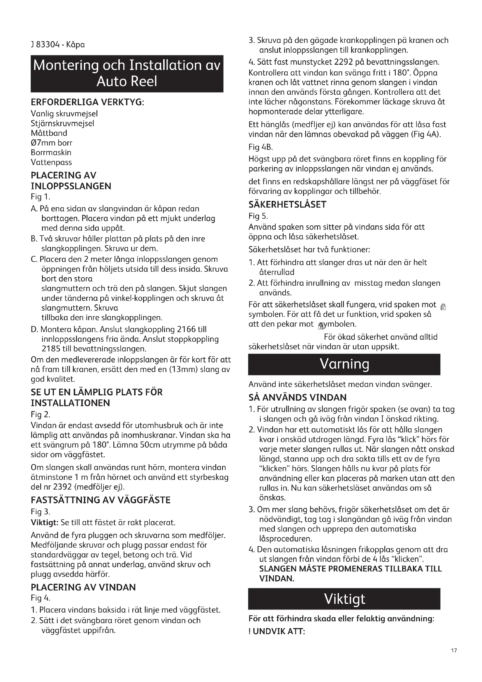 Innehåll17 J 83304 - Kåpa ERFORDERLIGA VERKTYG: Vanlig skruvmejsel Stjärnskruvmejsel Måttband Ø7mm borr Borrmaskin Vattenpass PLACERING AV INLOPPSSLANGEN Fig 1. A. På ena sidan av slangvindan är kåpan redan borttagen. Placera vindan på ett mjukt underlag med denna sida uppåt. B. Två skruvar håller plattan på plats på den inre slangkopplingen. Skruva ur dem. C. Placera den 2 meter långa inloppsslangen genom öppningen från höljets utsida till dess insida. Skruva bort den stora slangmuttern och trä den på slangen. Skjut slangen under tänderna på vinkel-kopplingen och skruva åt slangmuttern. Skruva tillbaka den inre slangkopplingen. D. Montera kåpan. Anslut slangkoppling 2166 till innloppsslangens fria ända. Anslut stoppkoppling 2185 till bevattningsslangen. Om den medlevererade inloppslangen är för kort för att nå fram till kranen, ersätt den med en (13mm) slang av god kvalitet. SE UT EN LÄMPLIG PLATS FÖR INSTALLATIONEN Fig 2. Vindan är endast avsedd för utomhusbruk och är inte lämplig att användas på inomhuskranar. Vindan ska ha ett svängrum på 180°. Lämna 50cm utrymme på båda sidor om väggfästet. Om slangen skall användas runt hörn, montera vindan ätminstone 1 m från hörnet och använd ett styrbeskag del nr 2392 (medföljer ej).