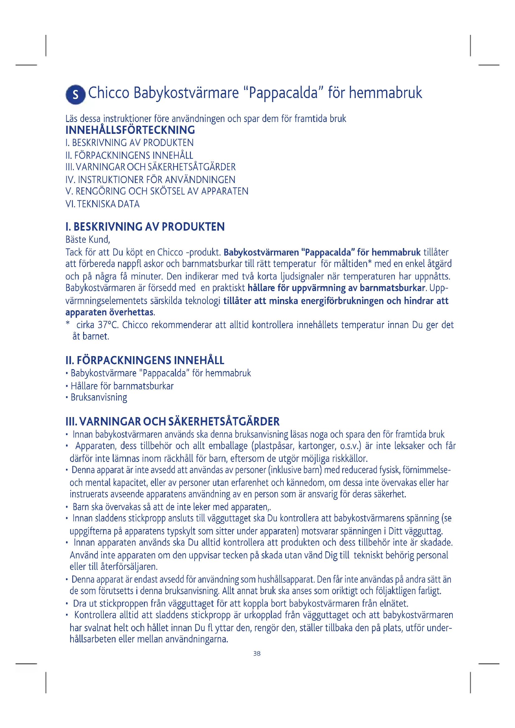 Bäste Kund, Tack för att Du köpt en Chicco -produkt. Babykostvärmaren “Pappacalda” för hemmabruk tillåter att förbereda nappfl askor och barnmatsburkar till rätt temperatur för måltiden* med en enkel åtgärd och på några få minuter. Den indikerar med två korta ljudsignaler när temperaturen har uppnåtts. Babykostvärmaren är försedd med en praktiskt hållare för uppvärmning av barnmatsburkar. Upp- värmningselementets särskilda teknologi tillåter att minska energiförbrukningen och hindrar att apparaten överhettas.