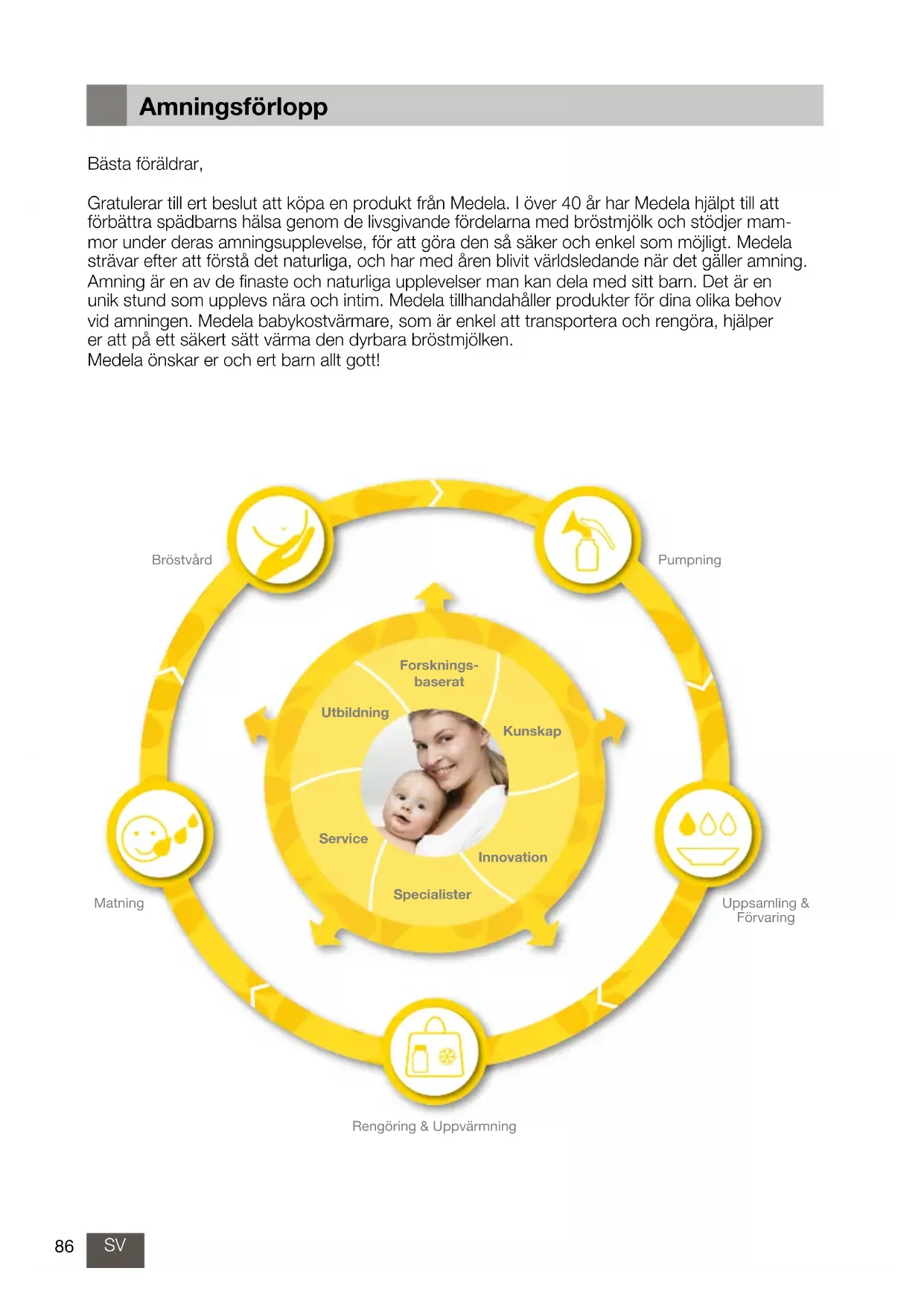 Amningsförlopp Bästa föräldrar, Gratulerar till ert beslut att köpa en produkt från Medela. I över 40 år har Medela hjälpt till att förbättra spädbarns hälsa genom de livsgivande fördelarna med bröstmjölk och stödjer mam- mor under deras amningsupplevelse, för att göra den så säker och enkel som möjligt. Medela strävar efter att förstå det naturliga, och har med åren blivit världsledande när det gäller amning. Amning är en av de finaste och naturliga upplevelser man kan dela med sitt barn. Det är en unik stund som upplevs nära och intim. Medela tillhandahåller produkter för dina olika behov vid amningen. Medela babykostvärmare, som är enkel att transportera och rengöra, hjälper er att på ett säkert sätt värma den dyrbara bröstmjölken. Medela önskar er och ert barn allt gott! Pumpning Uppsamling & Förvaring Rengöring & Uppvärmning Matning Bröstvård Innovation Forsknings- baserat Specialister Service Kunskap Utbildning87SV Produktöversikt På/av Välj Enter
