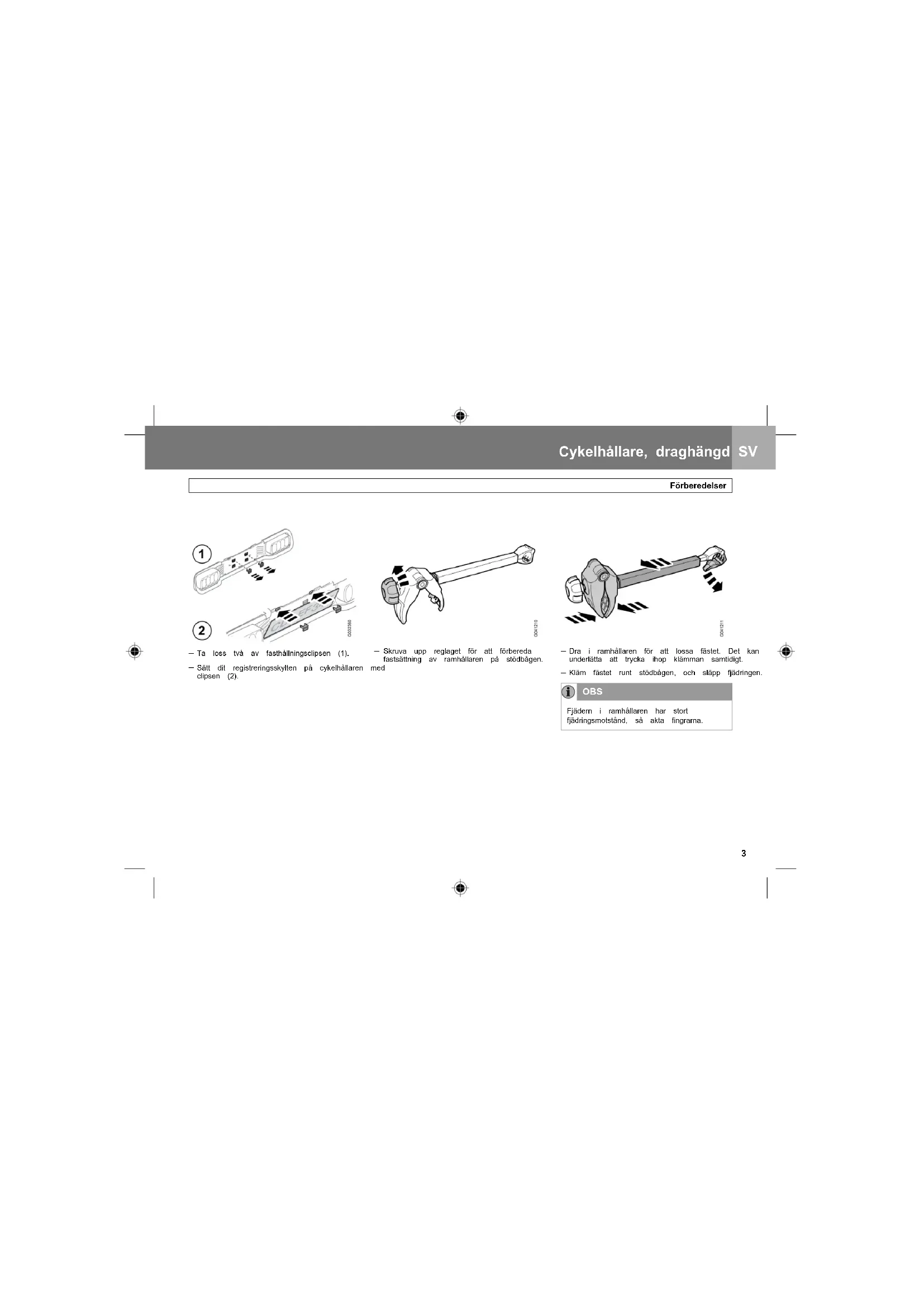 Kläm fästet runt stödbågen, och släpp fjädringen. OBS Fjädern i ramhållaren har stort fjädringsmotstånd, så akta fingrarna. Cykelhållare, draghängd SV Förberedelser