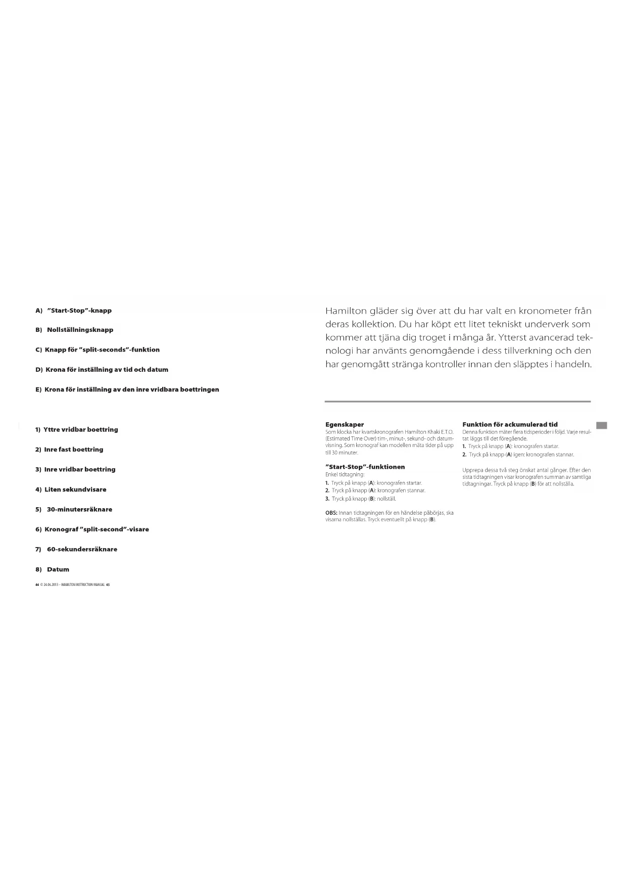 ringen (1) vid den röda pilen = 17,5 km/h. Ställa in tidszon och datum När man drar ut kronan (D) till mellanpositionen (1), kan timvisaren yttas framåt eller bakåt utan att minut- och sekundvisarnas inställning påverkas. Datumet ändras varje gång klockans timvisare passerar midnatt. OBS: Kronorna (D) och (E) skruvas ner för att garantera bästa möjliga vattenbeständighet. De måste lossas för att deras respektive funktioner ska bli tillgängliga. Se till att skruva ner dem igen efter varje gång de har använts. Ställa klockan När kronan (D) är i position (2), stannar samtliga visare – även sekundvisaren – och tim- och minutvisarna kan ställas in efter behov. Ställa in kronografen (Om visarna inte är exakt inställda på noll.) När en kronografvisare roterar, tryck på knapp (A) för att stoppa kronografen och tryck sedan på knapp (B): visarna återgår till sina startlägen. Om visarna inte återgår exakt till noll, kan varje visare nollställas på följande sätt: 30-minutersräknare Ställ krona (D) i position 1: tryck på knapp (A) 60-sekundsräknare (vit visare – ”split-second”-visare) Ställ krona (D) i position 2: tryck på knapp (A) 60-sekundsräknare (röd visare – löpande sekundvisare) Ställ krona (D) i position 2: tryck på knapp (B) Märk: Visarna kan yttas framåt snabbare om man trycker på knappen i mer än en sekund. Viktigt: Låt inte kronan vara position 1 i mer än 20 minuter, eftersom detta kan störa tidtagarfunktionen.50 © 24.06.2013 – HAMILTON INSTRUCTION MANUAL 51 Hamilton koleksiyonundan bir saat seçtiğiniz için çok mutluyuz. Size yıllarca sadakatle hizmet edecek bir teknoloji harikası edin- diniz. Bu saat en gelişmiş teknolojiler kullanılarak üretilmiştir ve satışa sunulmadan önce sıkı kontrollerden geçirilmiştir. Özellikleri Hamilton Khaki E.T.O. (Estimated Time Over) quartz kro- nografı, bir kol saati olarak, saati, dakikayı, saniyeyi ve tarihi gösterir. Bir kronograf olarak kullanıldığında ise, 30 dakikaya kadar süre ölçebilir. Başlatma-Durdurma fonksiyonu Tek bir süreyi ölçme: