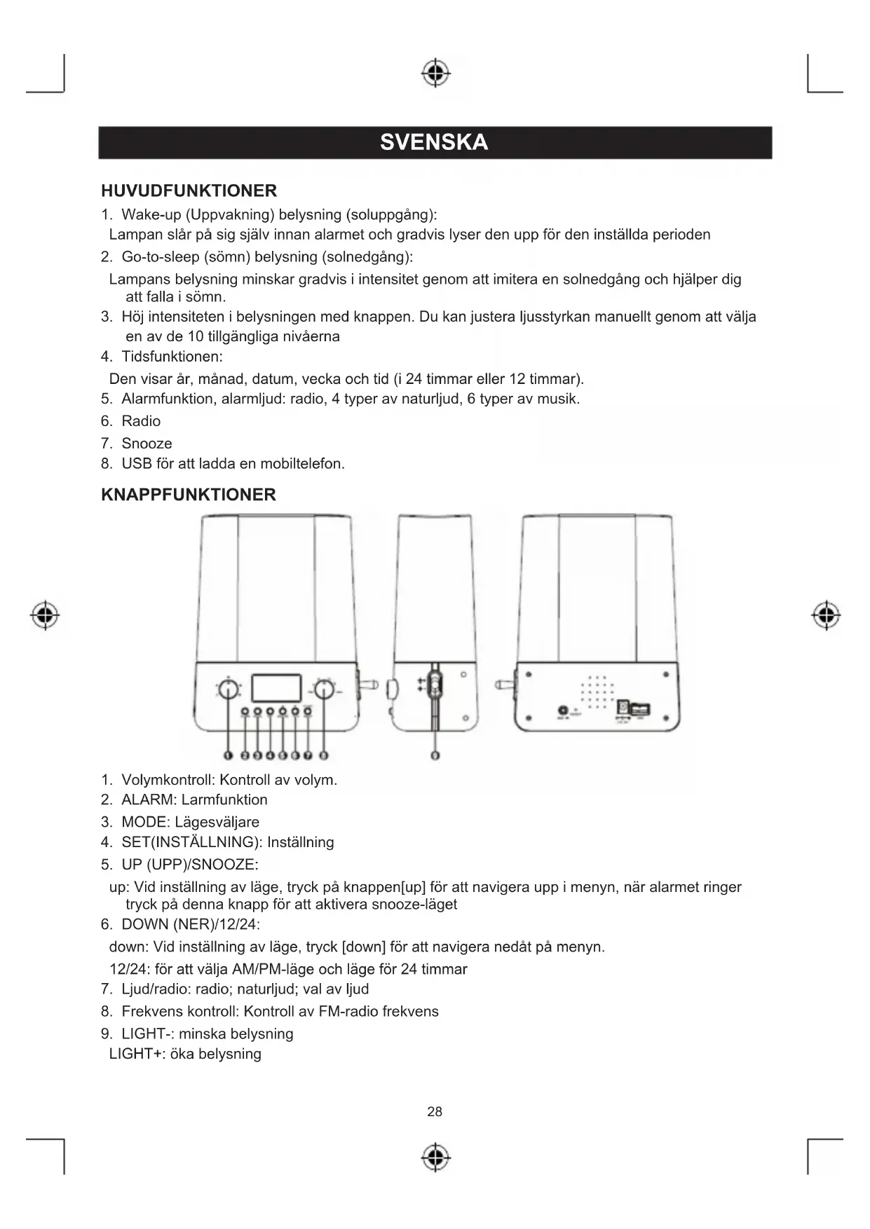- Alarmfungktion, alarmljud: radio, 4 typer av naturljud, 6 typer av musik.